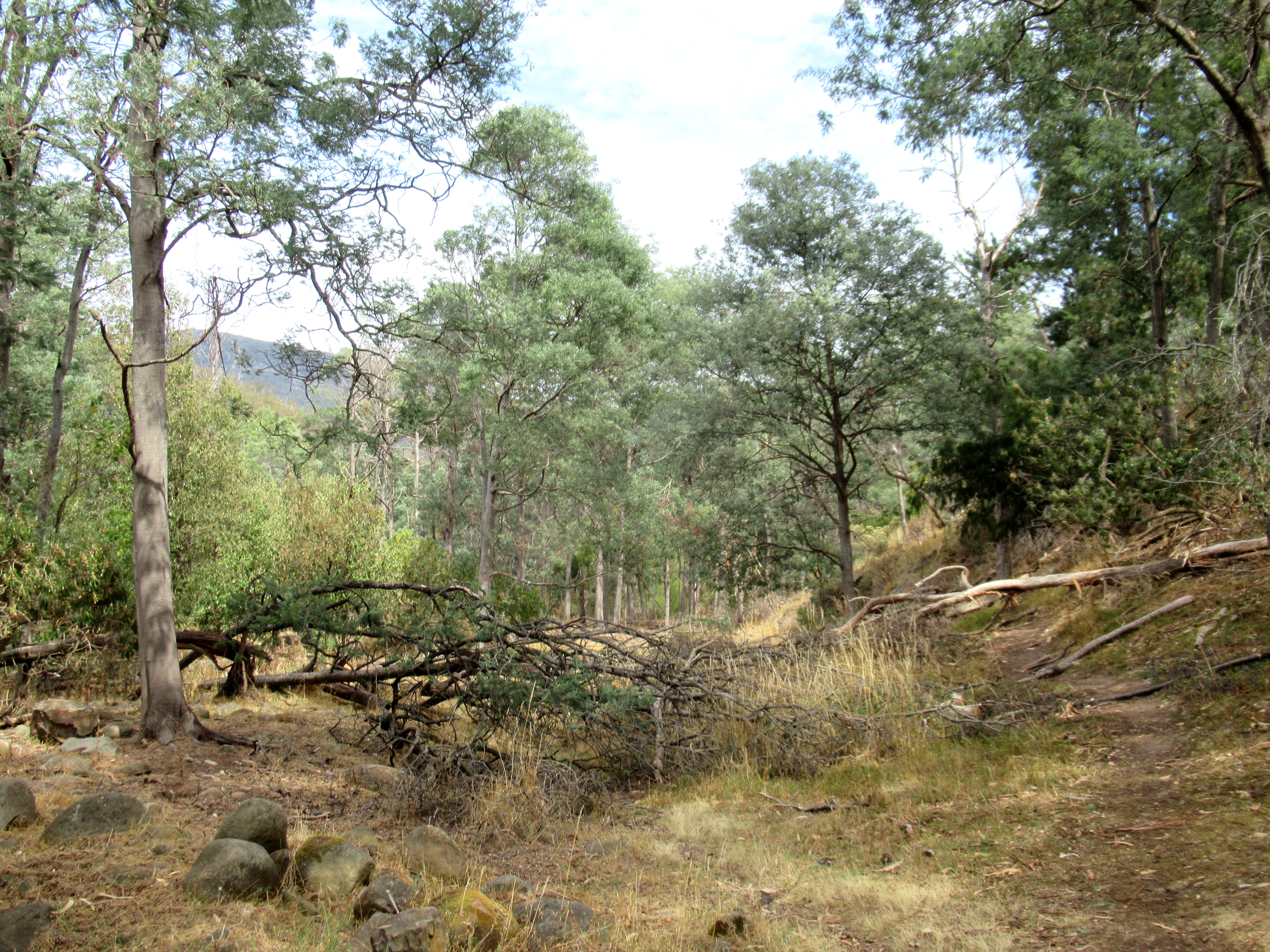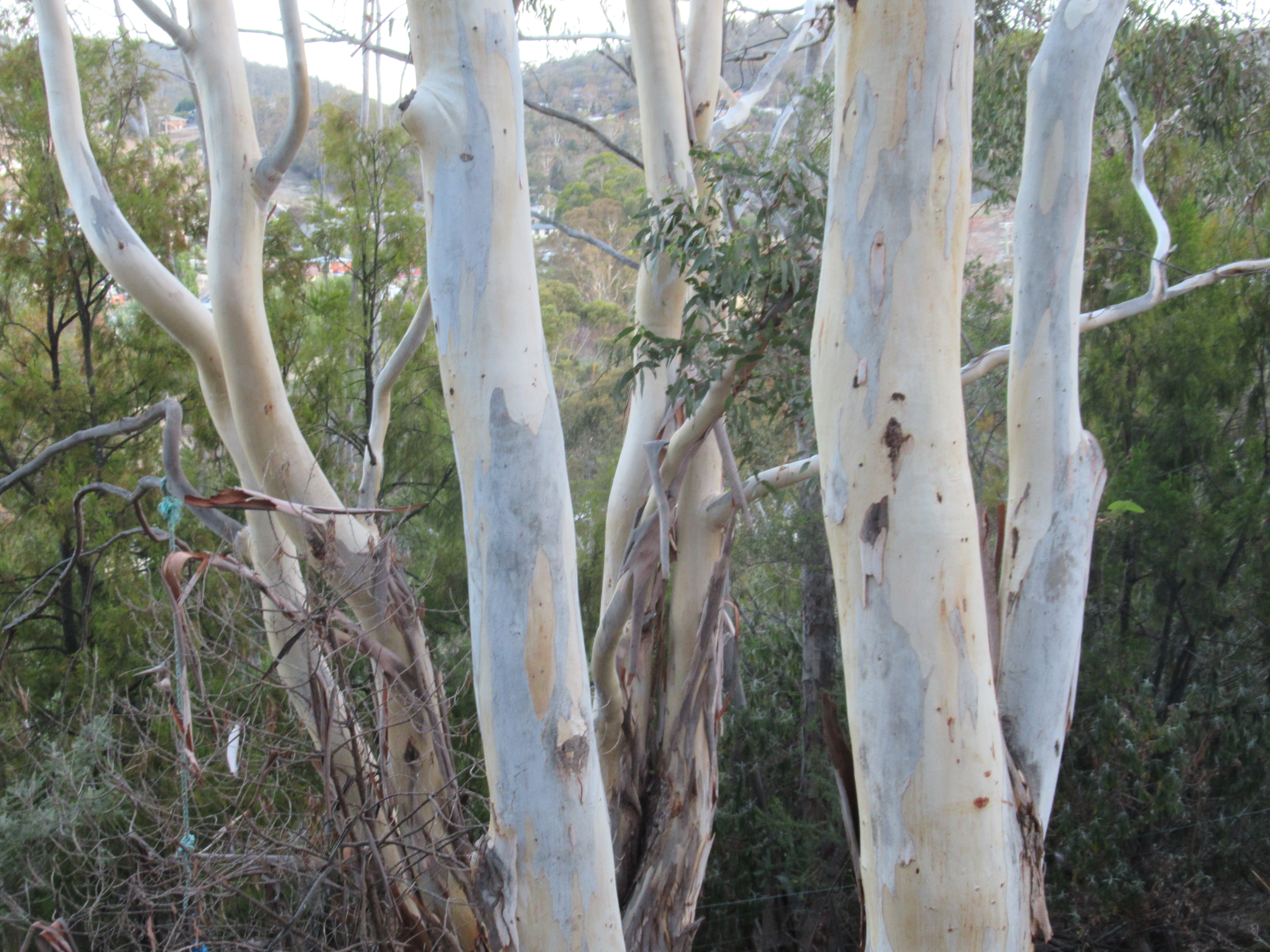 The lots here are really steep as we're on the foothills of Mount Wellington. I walk down to the back of the lot and into a nature reserve, passing these gum trees. I know what you're thinking -- I posted dead trees -- but they're not dead, they just shed their bark. It falls on the ground around the base of the tree.