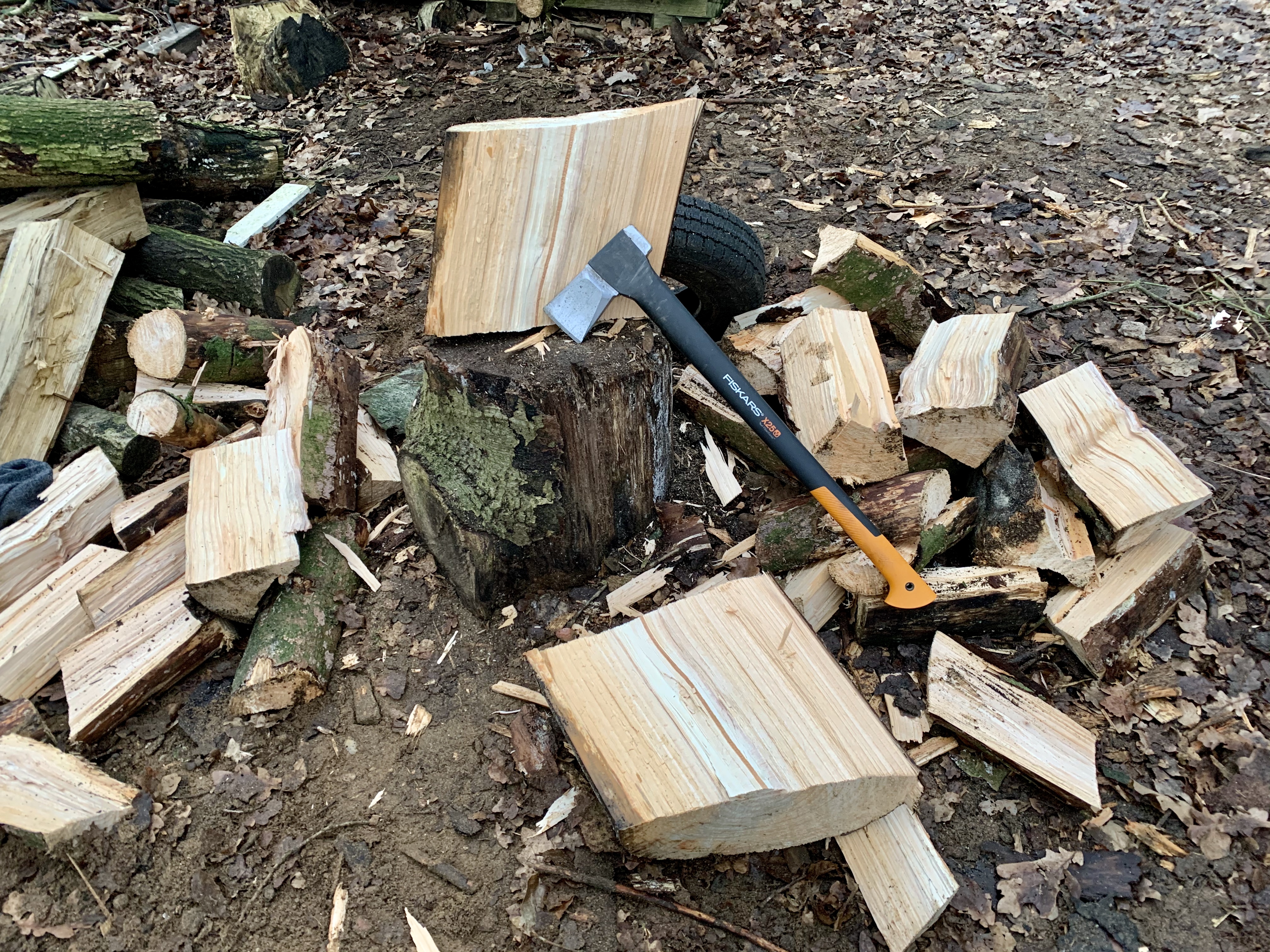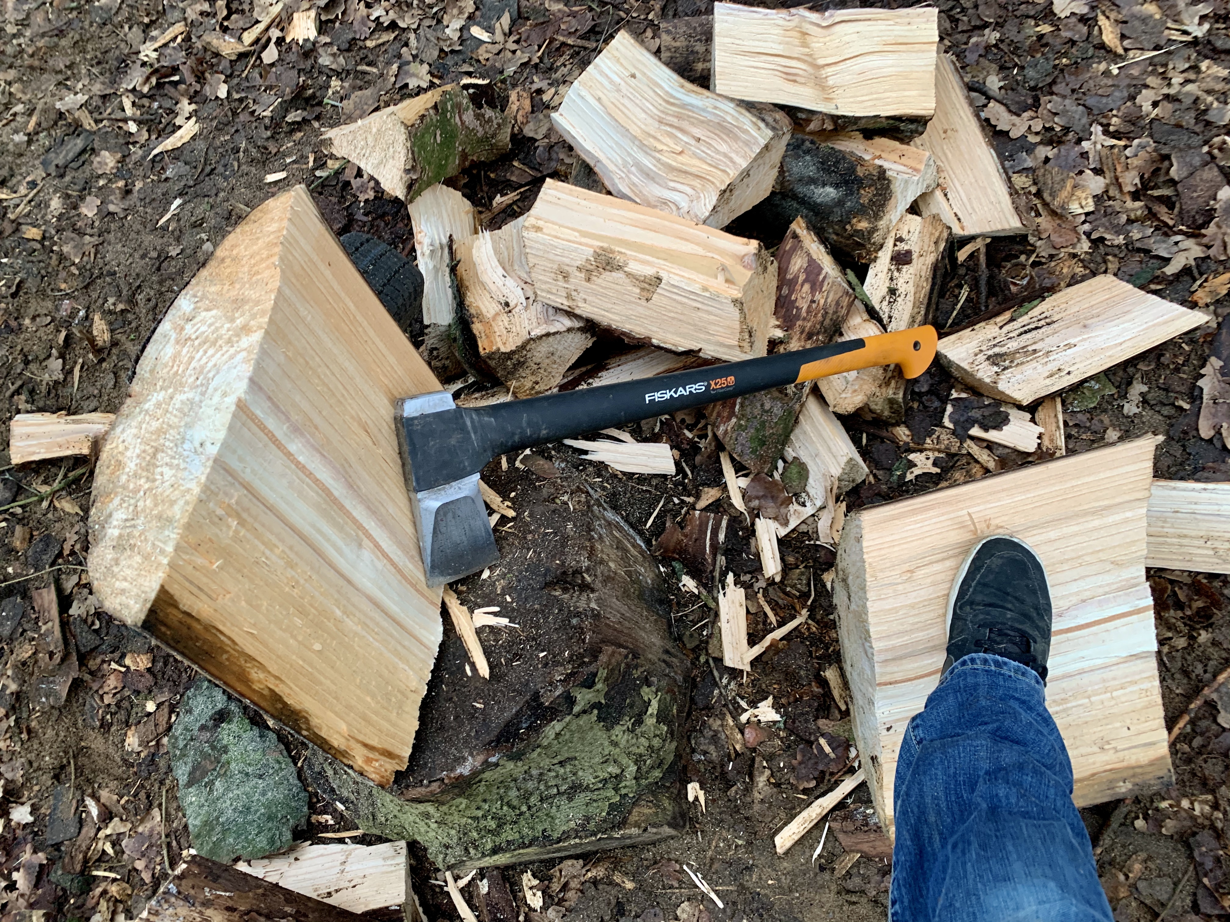 What I lack with a cheapo chainsaw I more than makeup with this fine Fiskars X25 axe. I can easily split those large rounds with this bad boy and nothing feels better when you split one on the first swing.