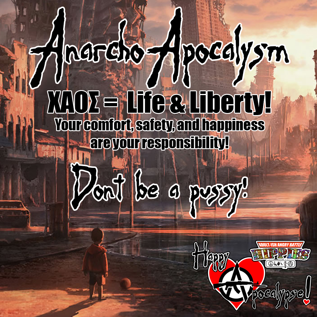 AnarchoApocalysm is the philosophical understanding that one cannot be truly free unless all are. The way to being truly free is needed in both mind and body. For this to be achieved, there will be a revelation of hidden truths and this alone will undo those that control the world. The systems built to subjugate will collapse and that affect the lives of every individual. Things like the oil-driven food distribution system will be heavily disrupted and cause "Chaos"...