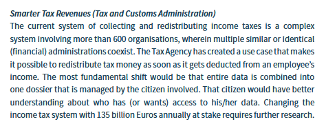 While blockchain technology can significantly improve the administrative process of the government, there are also some other aspects that I'm not that keen on. The most important aspect is, as you might suspect, tax collection. If you read this, you probably don't like to be coerced into contributing to an immoral and inefficient system (in other words, taxation is theft). Let's see what the Dutch government has been up to.