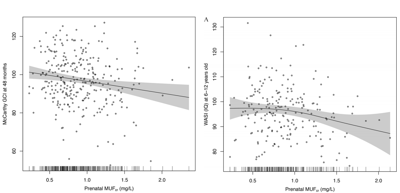 Adjusted association of maternal urinary fluoride (MUFcr) and General Cognitive Index (GCI) scores in children at age 4 y (left) and children’s IQ at age 6–12 y (right) | source