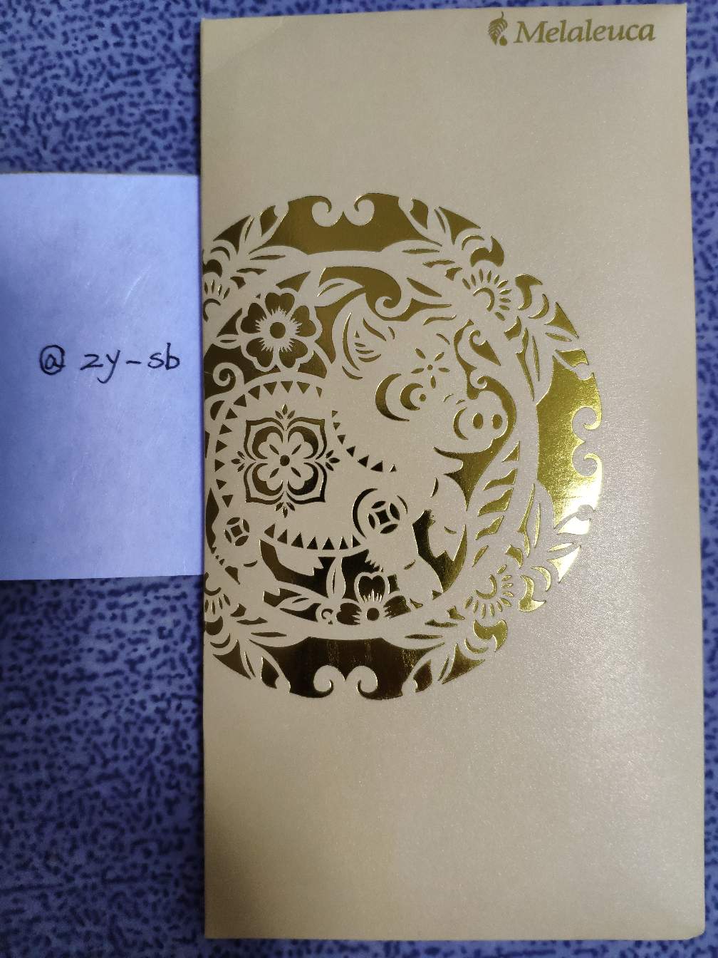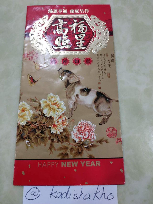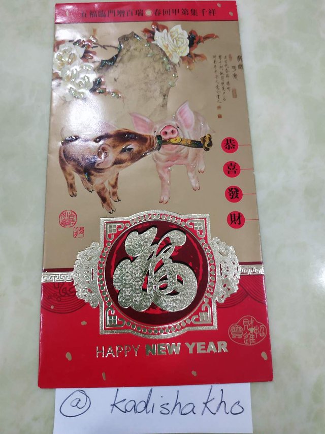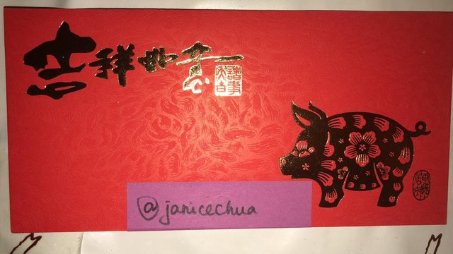 1.Take an original photo of angpao/ red packet. Note: Need to have pig design in the angpao. Include a piece of paper written with your Steemit ID, place with/along with the angpao, as it serves verification purposes.
