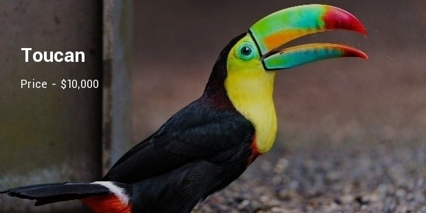 De Brazza’s Monkey is very old and is the most expensive animal ever known in the world. It is also referred to swampy monkey and its name was derived from a French traveler. They are difficult to locate because they have extremely different and unique camouflaging styles. Their life span is between 22 to 30 years. They live in Central Africa and they always travel in large groups.Toucan - $10,000