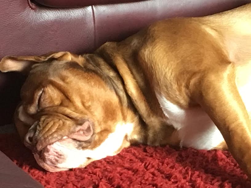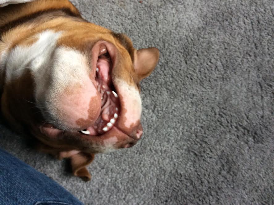 This is Tater. He's an Olde English Bulldogge, which is apparently a mixture of an American Bulldog and a standard Bulldog. IMO it's more like a hand grenade and a rhinoceros had a lovechild. He is hands down the biggest nightmare I have ever looked after, boisterous, stubborn and a total "velcro" dog, not happy unless he's following you around so closely he's stepping on your feet. He is uglorable though, and he has such a sweet and vivacious personality it's impossible to stay mad at him for long. Here's some pics of when we first got him, and now.