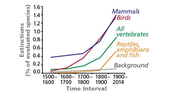 In the past 500 years, many vertebrate species have perished, primarily due to hunting and loss of habitat. This graph, from a Science Advances study, shows the increasing percentage of animals lost over time, compared with the losses that would have occurred naturally (dotted line).