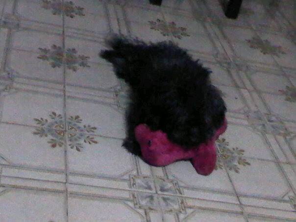 She has many toys, some she destroys them and her human mommy has to come to sew them because she loves them and she gets jealous if they take them off for a long time