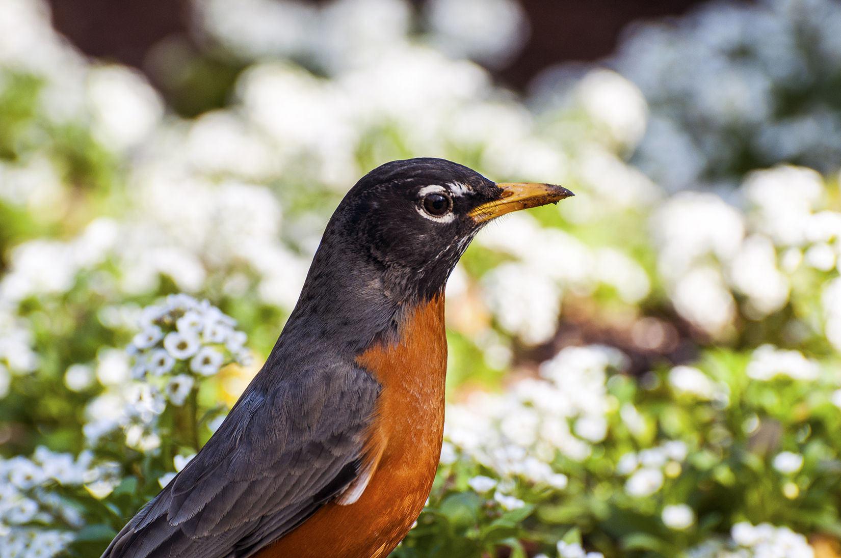 While out enjoying the gardens behind the Castle (Smithsonian Institution Building, Washington DC) I happened upon someone trying to rustle up some breakfast. From the looks of it he'd been at it a bit already but didn't seem to be having much luck. Although my attention wasn't appreciated, I watched for a while hoping to get a shot of it catching/eating a worm. Naturally, that never happened. I guess whoever came up with that saying never met this particular robin...