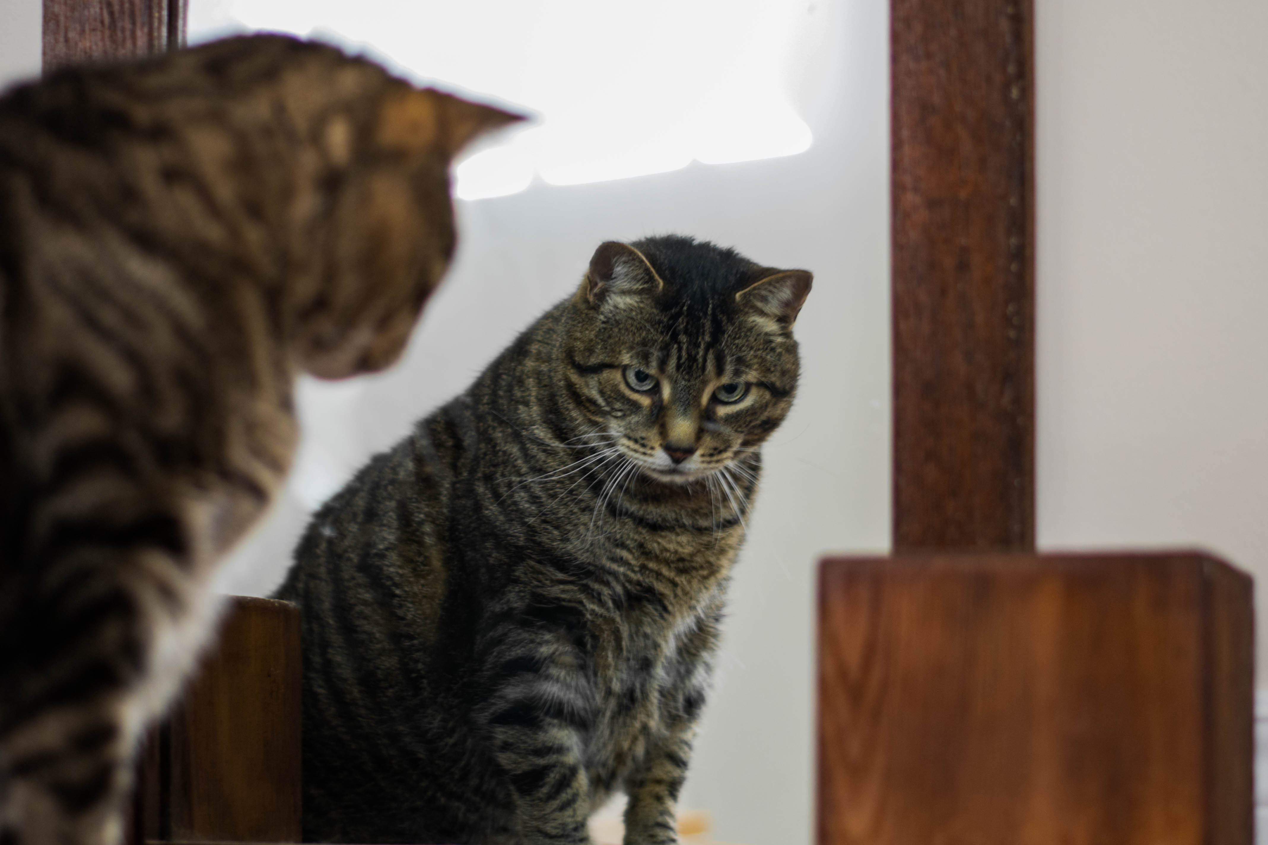 Nice story in form of photos! Does cat have a name? Nice shot of camera lady and the cat with the mirror.