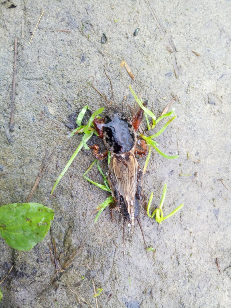 The pouring rain filled her hole and she crawled to the surface. I had at least Three mole cricket in the country. In the evening they chirp and call the male. You can find them by sound.