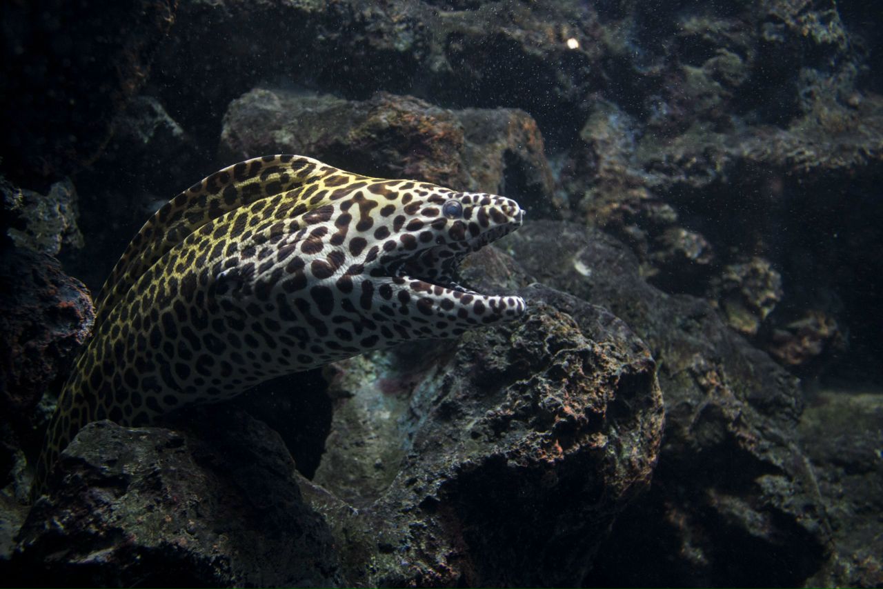 This moray was photographed while traveling to Thailand. We visited the aquarium, where we could observe a lot of marine life, including this dangerous but beautiful creature.