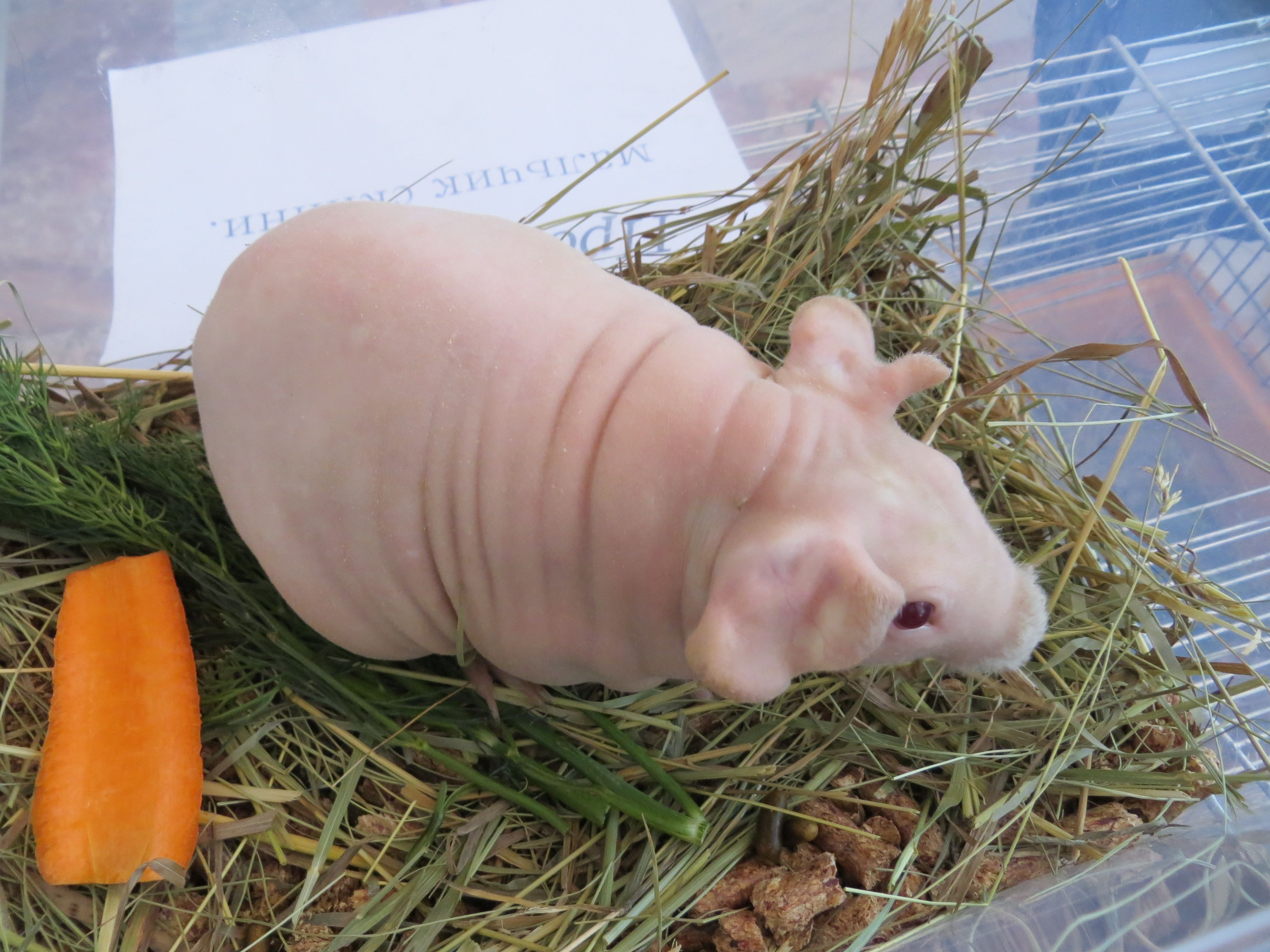 Лысые морские свинки тоже бывают. Они называются скинни. На ощупь очень приятные. Но их не все любят за их внешний вид