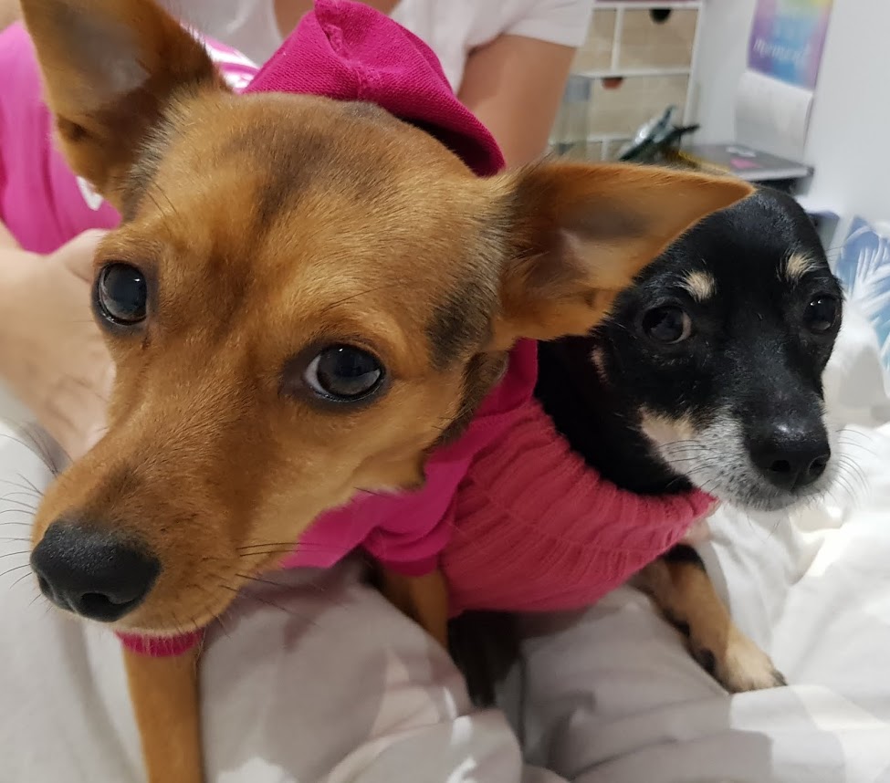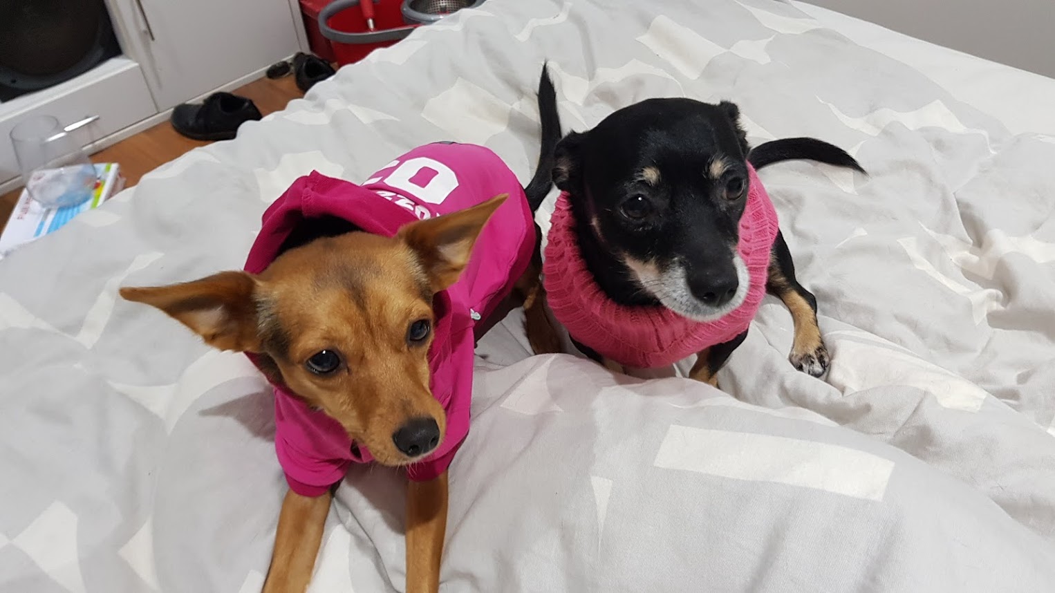 Thats so funny! A dog being scared of a little kitten. They look so cute in their jumpers.