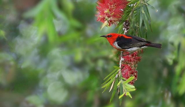 绯红澳鵖是雀形目和澳大利亚狒狒科的动物。它被发现在澳大利亚和新西兰,包括澳大利亚,新西兰,塔斯马尼亚岛和附近的岛屿。这种鸟。胸部和头部呈鲜红色,背部呈深灰色,喉咙呈白色。雌性除了臀部没有红色。这些鸟类一般情况下长3.9-5.2英寸,长约19-15厘米,重11-15克。