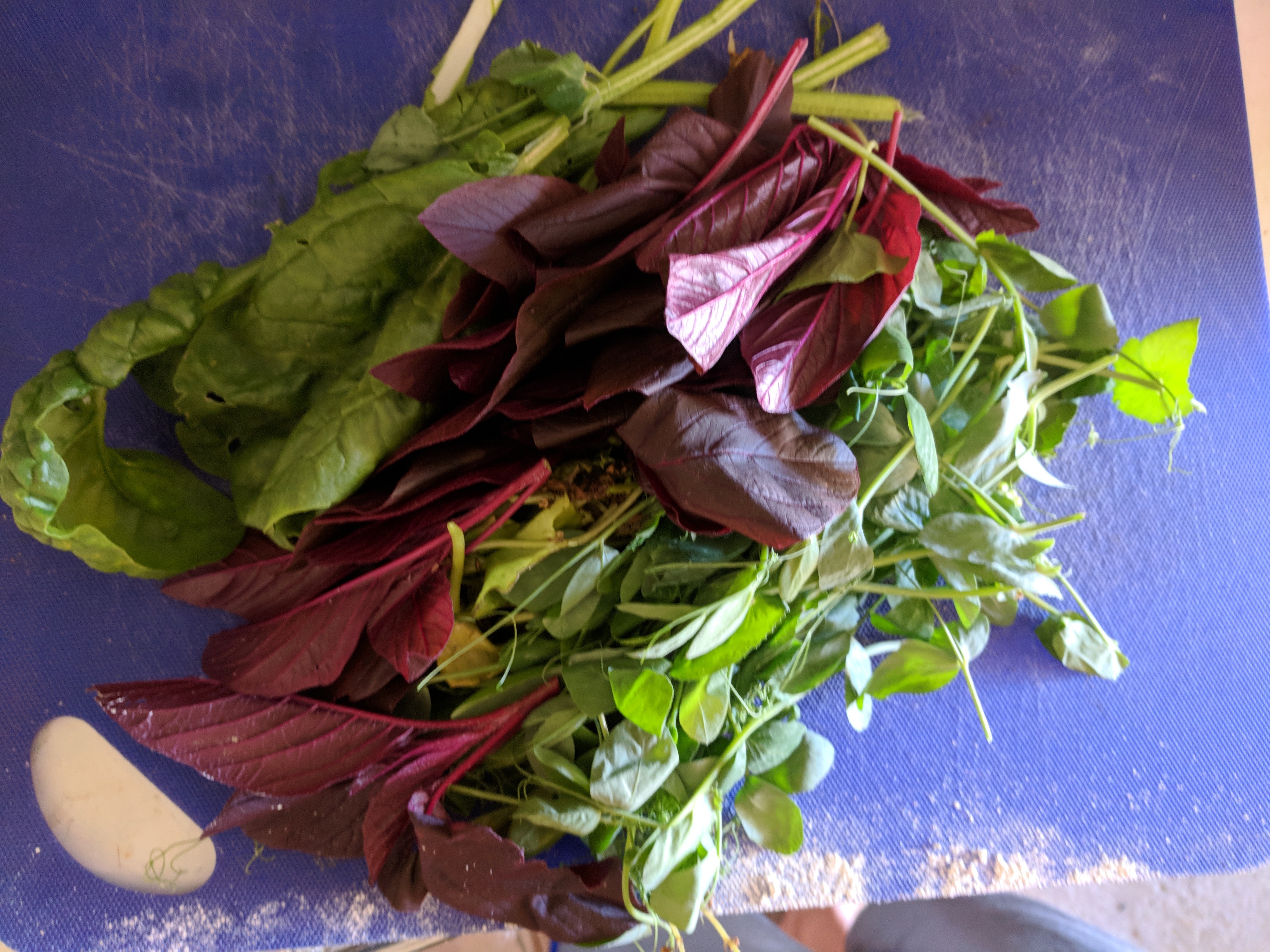 Have a look at the salads I'm serving these guys. I'm even putting olive oil on it to try and meet some requirements for the proper vitamins. They have spinach, pea shoots, red amaranth, and dandelion all fresh from the garden.