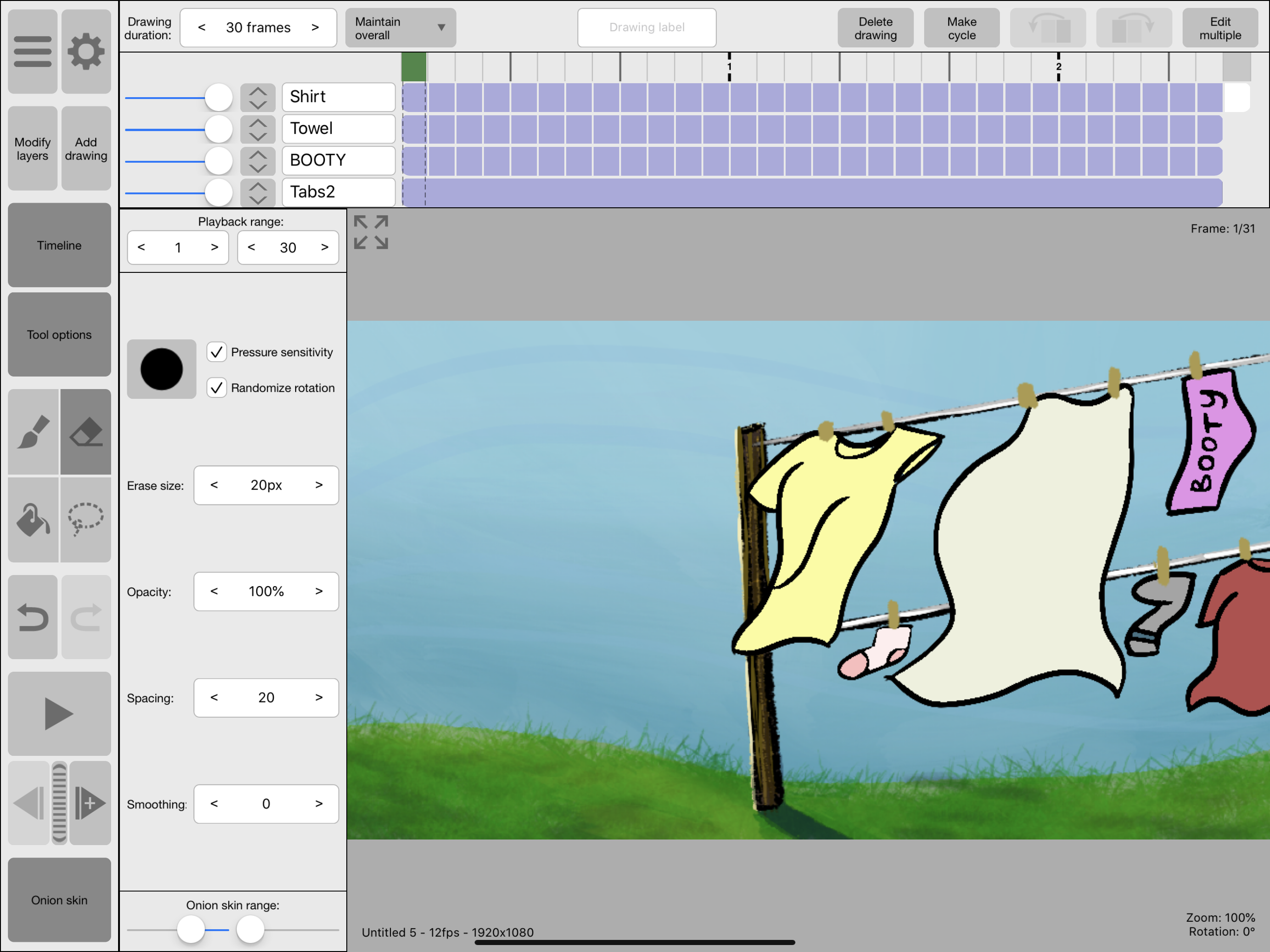 This is a HUGE bonus to using Rough Animator on a tablet - most tablet programs don’t allow you to cycle frames in the timeline. You have to be careful that it doesn’t look too stiff, but it can be a great tool to save a lot of time.
