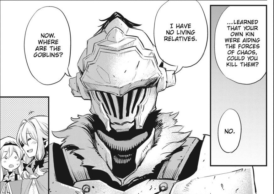 There are many ways to view the manga as a reader. You can either take it lightly and appreciate what the dark fantasy genre offers or you can start asking the real questions of what the goblins really represent. I recall one conversation by the campfire by our heroes mentioning goblins are born from the failures. If that were true, maybe the origin of goblins are brought by failures of humans as race and goblins tend to be the metaphor brought to life to haunt their world.