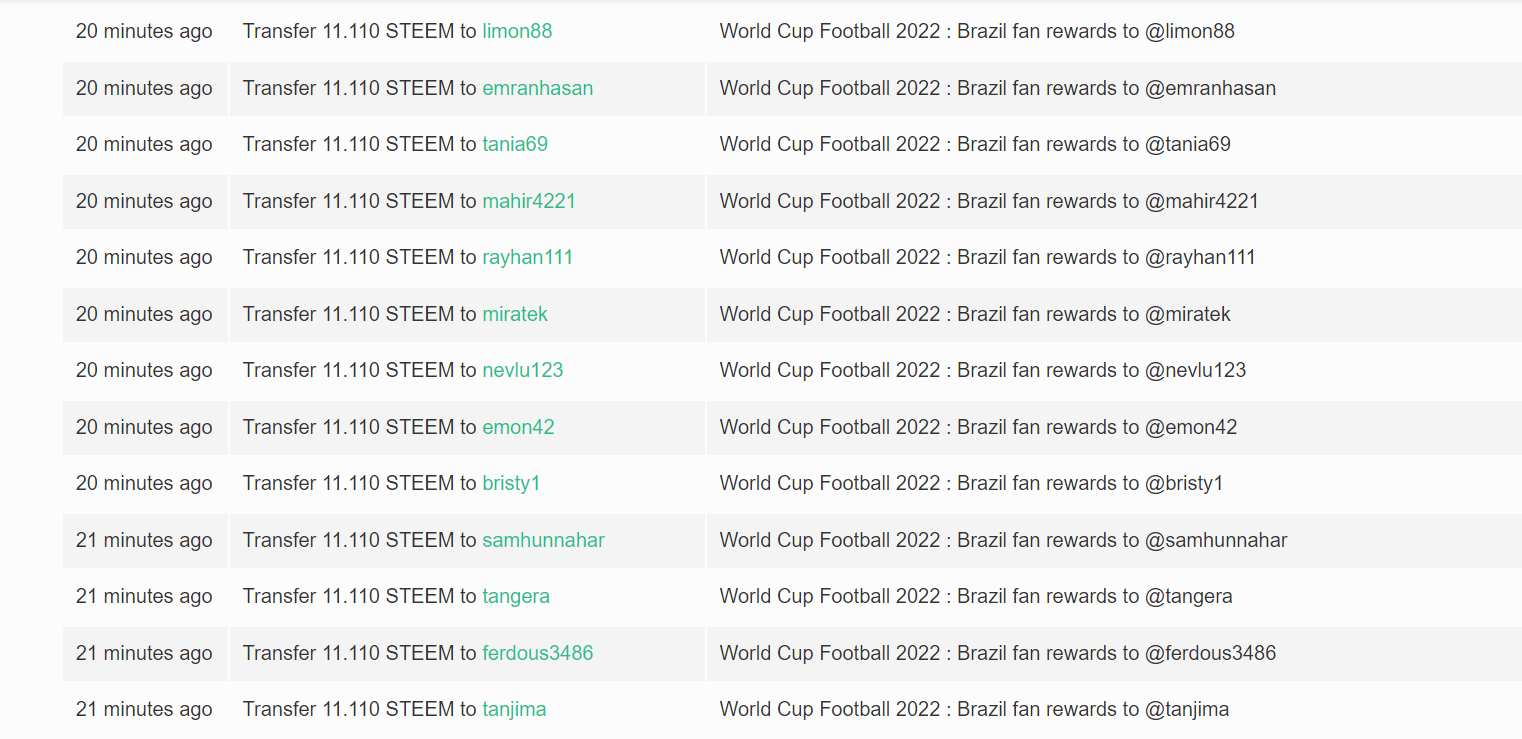 | 20 | 11.11 STEEM | @miratek | World Cup Football 2022 : Brazil fan rewards |