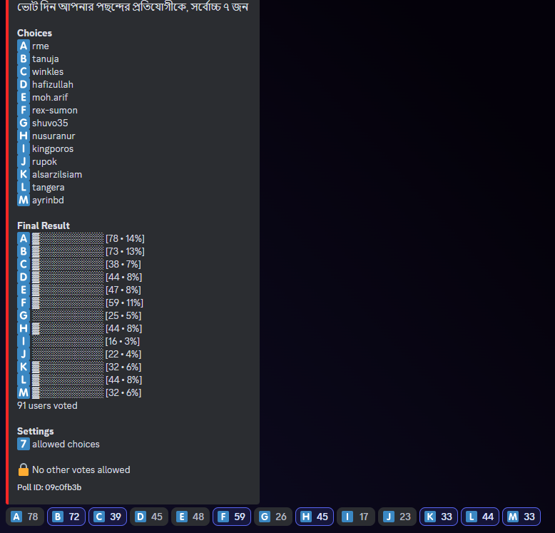 কমিউনিটির অফিসিয়াল ডিস্কর্ড সার্ভারের #announcement চ্যানেলে একটি poll create করা হয় । সেখানে সমস্ত প্রতিযোগীর স্টিমিট আইডি দেওয়া থাকে এবং নিচে তাদেরকে ভোট প্রদান করার জন্য বাটন থাকে । এক এক জন জেনারেল ইউজার সর্বোচ্চ ৭ জন প্রতিযোগীকে ভোট প্রদান করতে পারেন । পোলটিকে মোট ৪ ঘন্টা একটিভ রাখা হয়েছিল । এর মধ্যে প্রাপ্ত ভোটের নিরিখে প্রতিযোগীদের প্লেস নির্ধারণ করা হয় ।