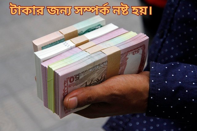 টাকা যেমন আমাদের অনেক সময় অনেক সম্পর্ক গড়তে সাহায্য করে। ঠিক তেমনটাই, টাকা অনেক সময় আমাদের অনেক সম্পর্ক নষ্ট করতেও সাহায্য করে এবং টাকার জন্য অনেক সময় অনেক সম্পর্ক নষ্ট হয়। আর এটার অনেকগুলো উদাহরণ আমার নিজের জীবনে ঘটেছে। অর্থাৎ যখনই একটা সম্পর্কে টাকার ব্যাপার চলে আসে। তখন আসলে অনেক ক্ষেত্রেই সম্পর্ক তে অনেক ভুল বুঝাবুঝি সৃষ্টি হয়। আর বিশেষ করে যারা টাকা ধার নেওয়ার উদ্দেশ্যে টাকা নেয়, ওরা নেওয়ার সময় যদিও অনেক নমো নমো করে টাকা নেয়। কিন্তু দেওয়ার বেলা আসলেই তাদের মেজাজ খারাপ হয়ে যায়। এটা আমি নিজেও অনেকবার দেখেছি। যদিও আমি খুব একটা মানুষকে কখনোই টাকা ধার দেই না। অর্থাৎ দিলে একেবারেই জন্য দিয়ে ফেলি। কারণ টাকা ধার নেওয়াটা আমার কাছে অহেতুক মনে হয়। অর্থাৎ টাকা ধার নেওয়ার কথা বলে আসলে কখনোই কেউ খুব একটা দিতে চায় না। অবশ্য সবার কথা বলছি না আমি কারণ অনেকেই রয়েছে ভিন্ন। তবে কারো কাছ থেকে প্রয়োজনে সময় টাকা ধার নিয়ে,তার প্রয়োজনে টাকা ফেরত না দেওয়াটা খুবই বাজে বিষয়।