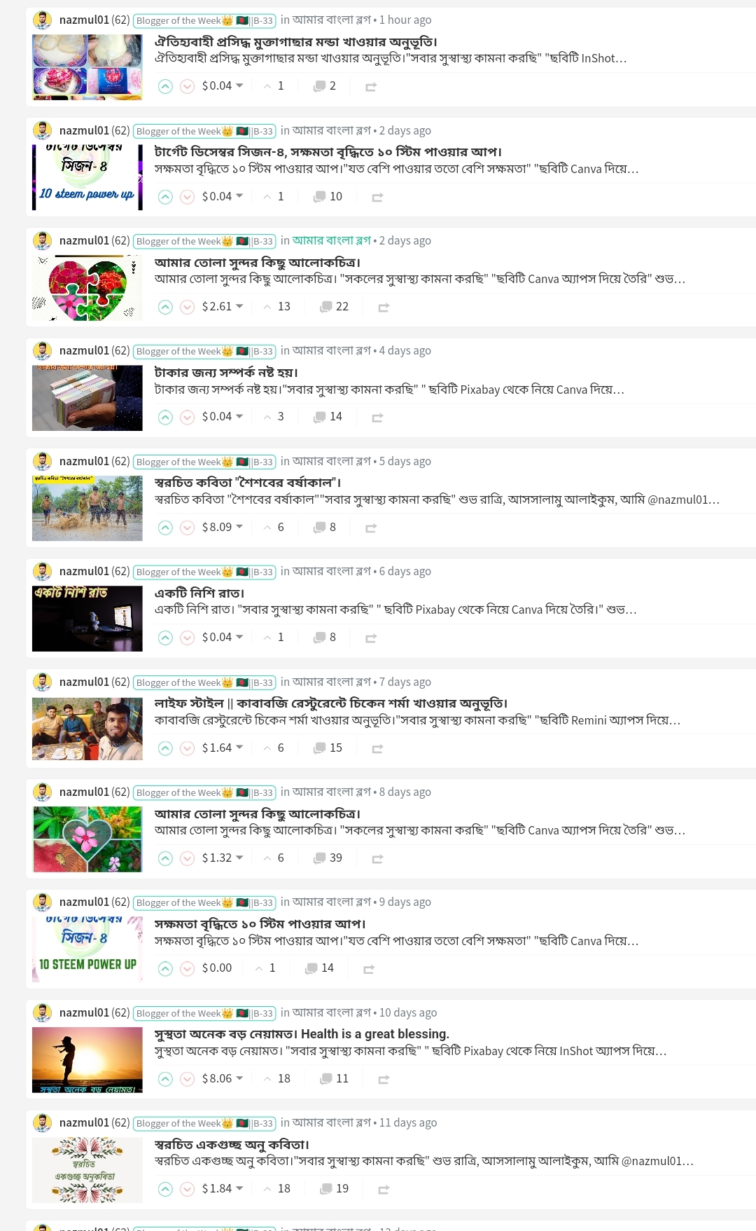 নাজমুল হাসান ভাই একজন স্টুডেন্ট আবার প্রাইভেট কোম্পানিতে জব করেও তার স্টিমিট জার্নি চালিয়ে যাচ্ছেন। সবসময় খুব সুন্দর সুন্দর ব্লগ আমাদের মাঝে শেয়ার করতেছেন। তিনির অনেক ব্লগ আমার পড়া হয়। আমি তিনির উজ্জল ভবিষ্যৎ কামনা করি। ধন্যবাদ।