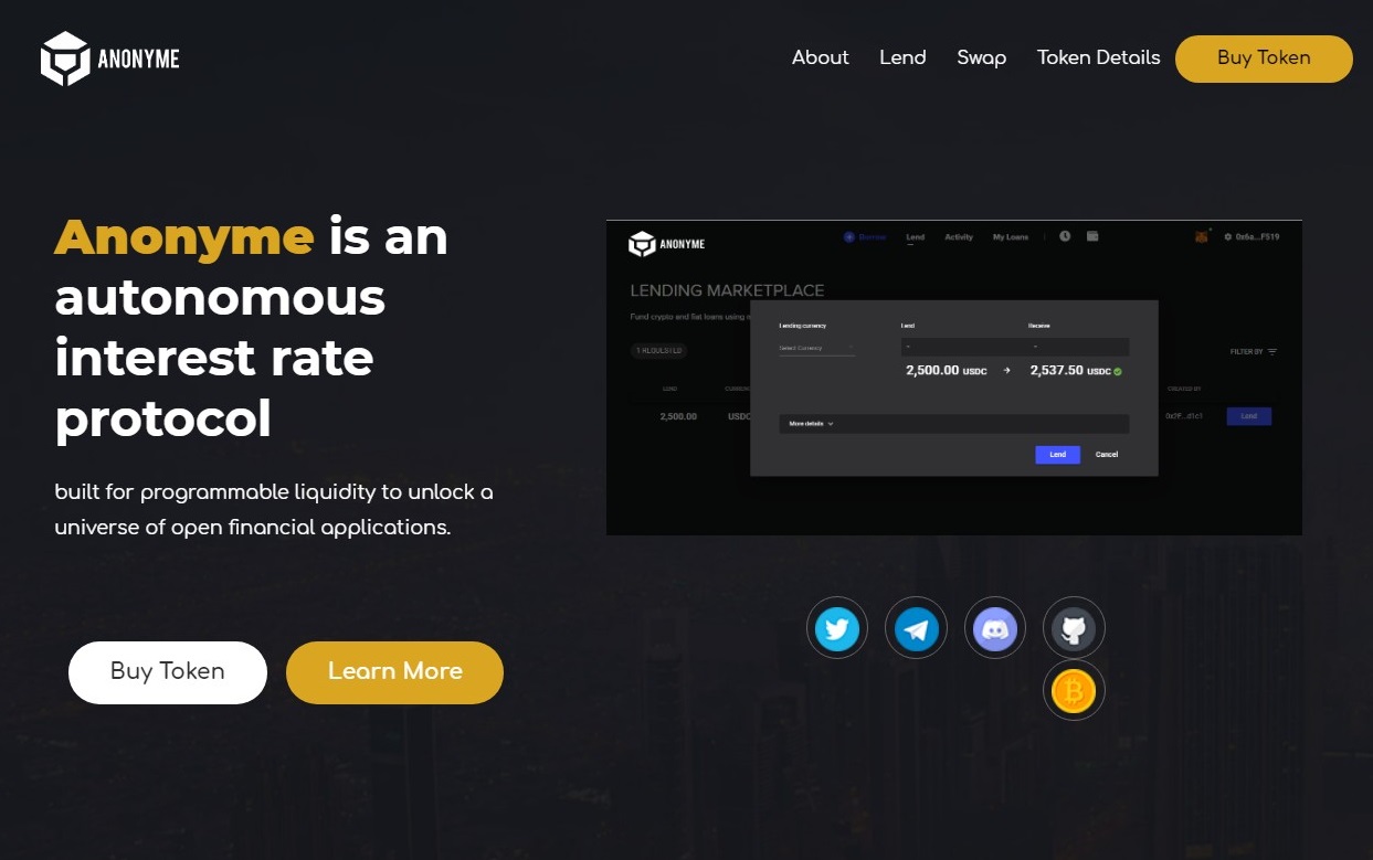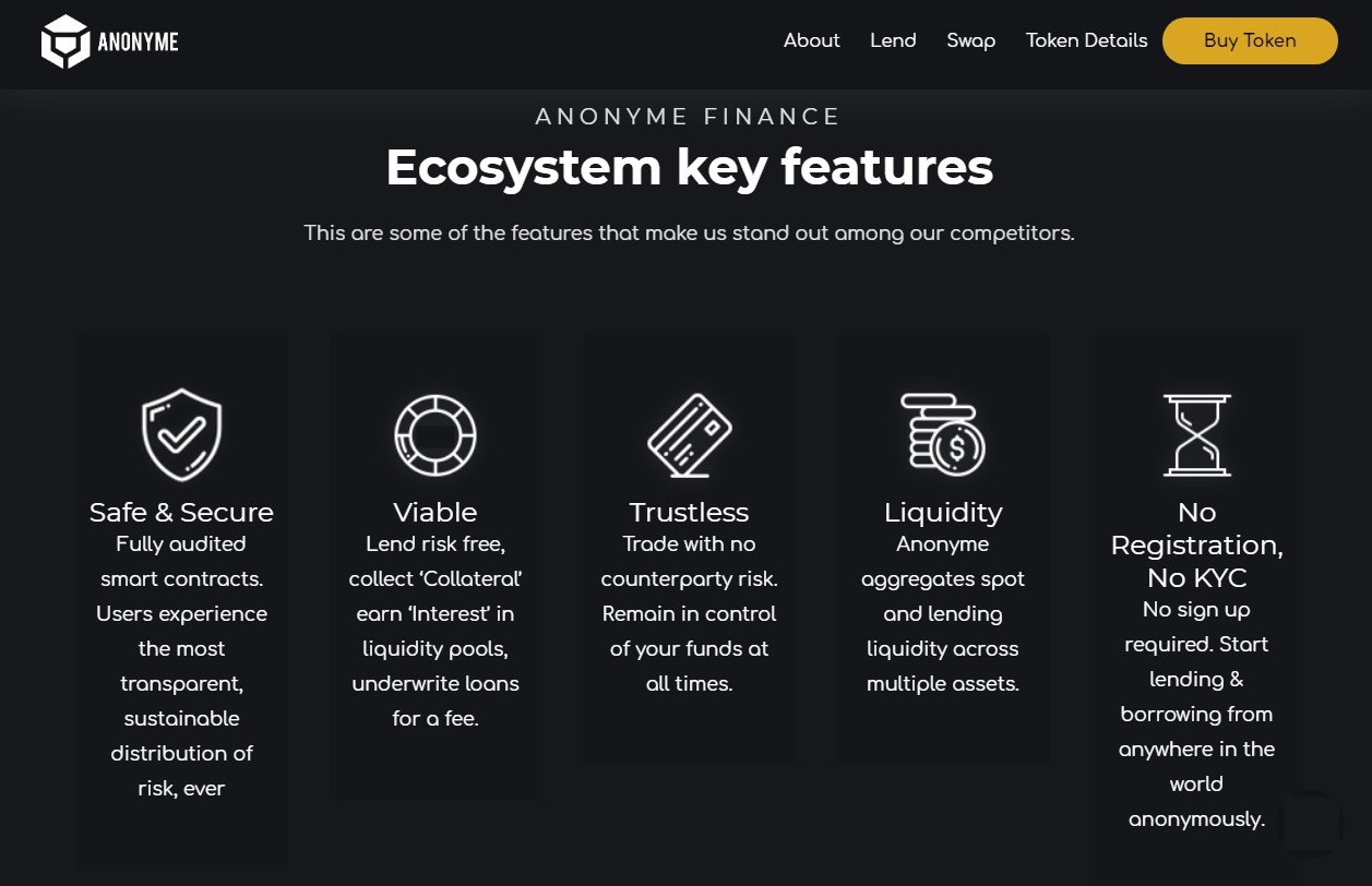 Anonyme is creating a platform built on the Ethereum blockchain that will link the borrower and lender. At the same time, all operations for obtaining a loan, as well as issuing a loan, will be completely confidential and the KYC verification procedure will not be required and there will not even be a need to register on the platform. Any crypto user, regardless of country of residence, will be able to take or issue credit funds.