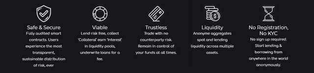 Anonyme concept is base around Lending, Borrowing, and to Earn Interest plus other rewards. The ability to lend, borrow, and earn interest in a trustless way is a fundamental breakthrough for financial markets. Anonyme will offer the full stack of technologies that would make this a reality.
