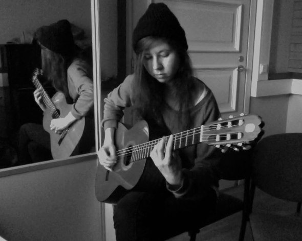 More than half of rehearsing time I was judged by the mirrors. And all the other times I was judged by my teachers, role models, audience and parents. I’ve spent hours of just standing with my guitar in front of a rehearsing room mirror, measuring fat on my stomach and spotting angles where my instrument would hide it. While playing guitar, I was constantly aware of how the instrument would feel to my body. My playing and self-esteem depended on it. The rule was that the body of the guitar had to touch both of my hip bones. If it did, I thought I played good, I felt worthy.
