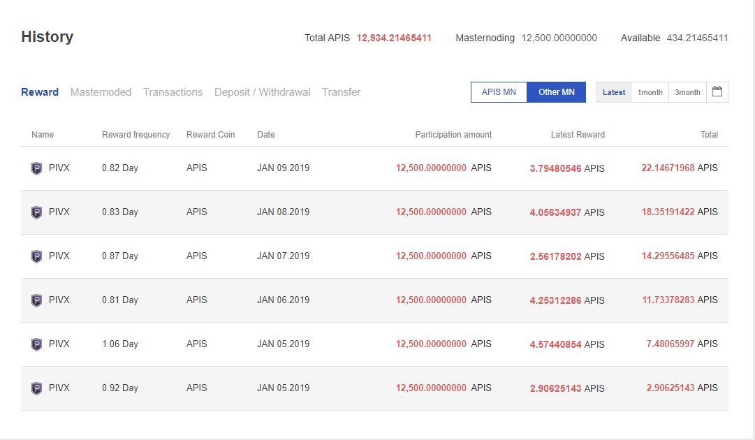 아피스 12500개로 pivx 마스터노드를 돌려보니 하루에 2.9개의 아피스가 생겼네요.