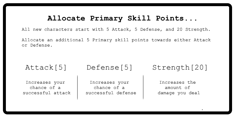 Allocate 5 Primary skill points between Attack & Defense. You'll need to decide if your character will be more offense or defensive minded. Not to worry, you'll have a chance to increase both of these by equipping gear in game. As you level up you'll receive additional skill points to assign as you choose.