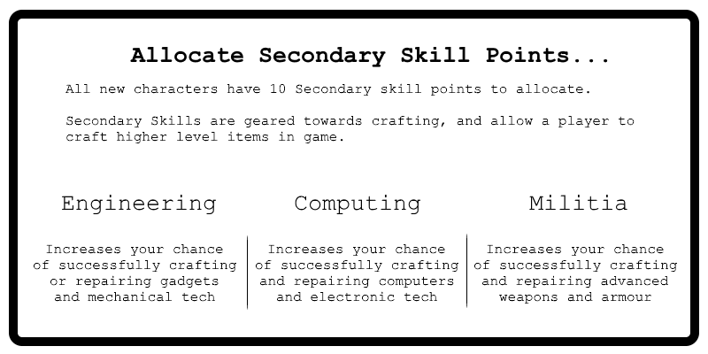 Allocate 10 Secondary skill points into crafting. You'll be able to craft all items, however Secondary skills with additional points will increase the chances of your success when crafting higher level items. As you level up you'll receive additional skill points to assign as you choose.
