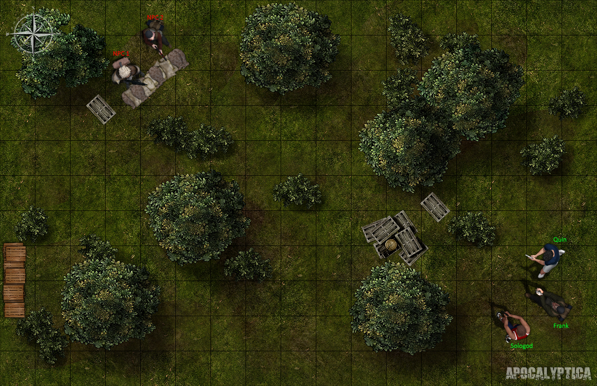 Our newly formed group of survivors makes their way through the forest in search of food and shelter. They stumble upon a couple of guys milling about to the north west, it looks like they may be guarding something..