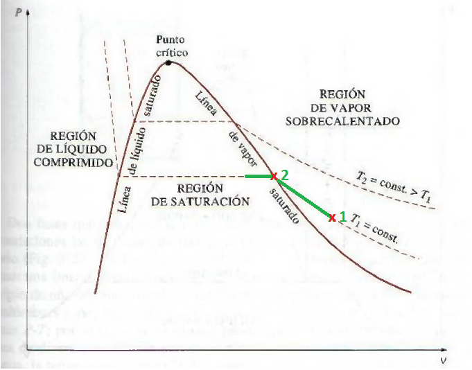 Haciendo énfasis en el segundo, para describir de forma sencilla este proceso, en la siguiente imagen se puede visualizar el diagrama de Presión vs Volumen específico de una sustancia. Si poseemos vapor sobrecalentado en las condiciones del punto 1, y lo comprimimos a temperatura constante, su volumen disminuirá, y su densidad aumentará, debido a que sus moléculas son obligadas a confinarse en un espacio mucho menor. Si continuamos el proceso de compresión, en el punto 2 la temperatura del vapor se iguala a la temperatura de saturación correspondiente a esa presión, por lo cual si continuamos comprimiendo se empezará a producir su condensación continua de vapor a fase líquida.