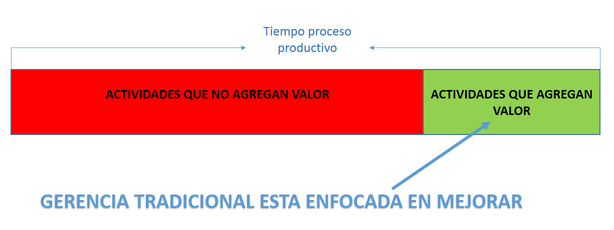 La gerencia tradicional busca mejorar sus tiempos productivos y la maximización de ganancias mediante el perfeccionamiento de sus actividades que agregan valor al proceso. Sin embargo, como vemos en la siguiente imagen, y es el factor determinante en el estudio realizado, la mayor cantidad de tiempo del proceso productivo es ocupado por actividades que no generan valor. Pues bien, los japoneses se dieron cuenta de este fenómeno y "EUREKA", desarrollaron herramientas gerenciales que les permitieran no solamente mejorar las actividades que generan valor, si no también disminuir y/o eliminar las actividades que no generan valor a la cadena productiva.