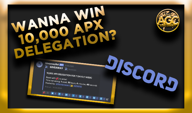 After joining you look out after the Category Info and click on the Channel 🎁giveaways. You see the current Giveaways/Raffles. To participate you just click on the 🎉 Emoji and thats it. After the Time is over the bot will draw a winner from all participants in this Raffle and he/she gets the 10,000 APX Delegation for 1 Week.