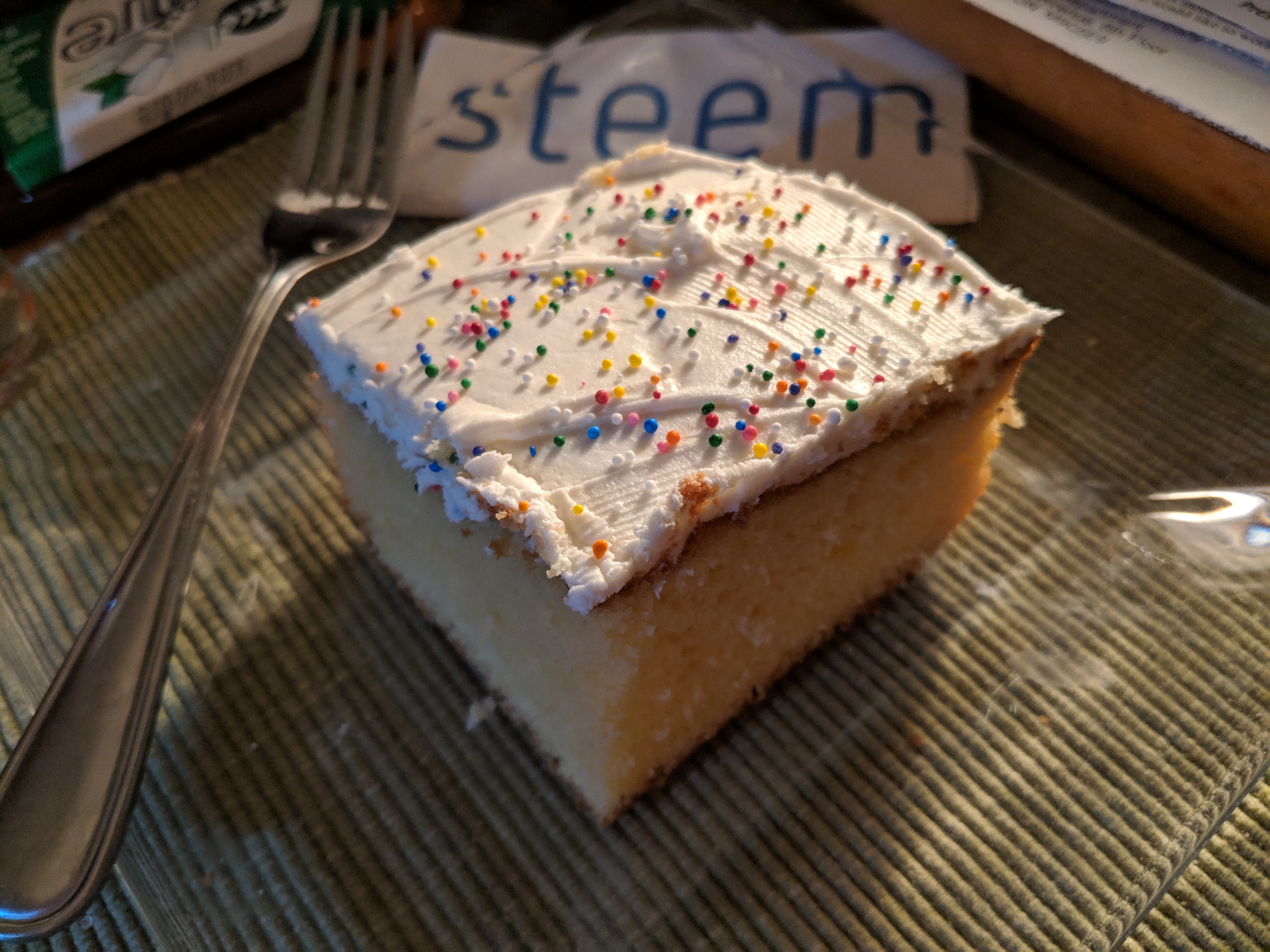 Love Golden Cake with Creamy Vanilla Frosting, DELICIOUS! It will give you lots of energy for playing Steem Monsters!