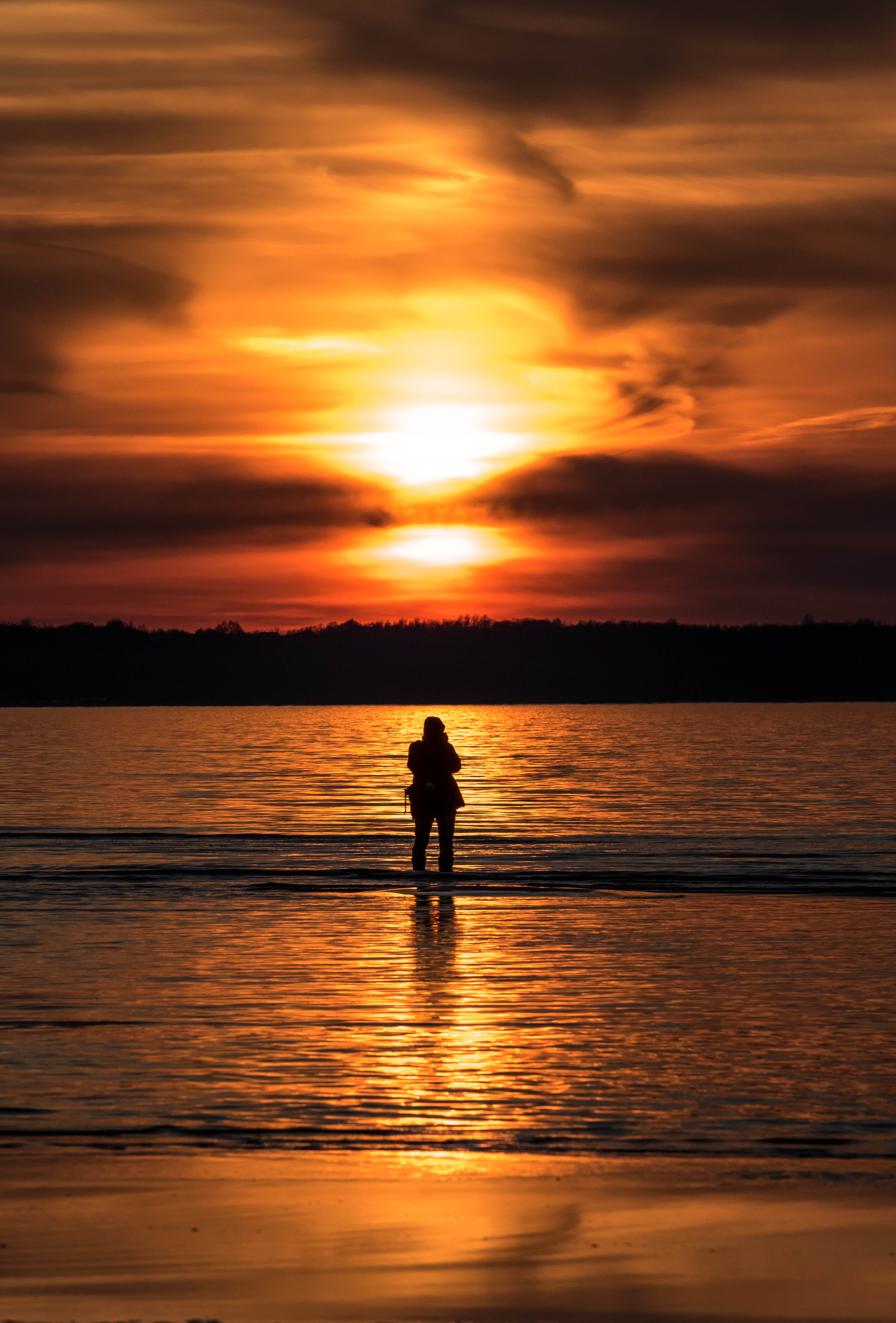 Colorful sunset at the coast of Baltic Sea. Just after recent storm the sea clam down a bit, but depending on currents still there is a possibility to catch some amber. So that's one of so called "amber hunters"