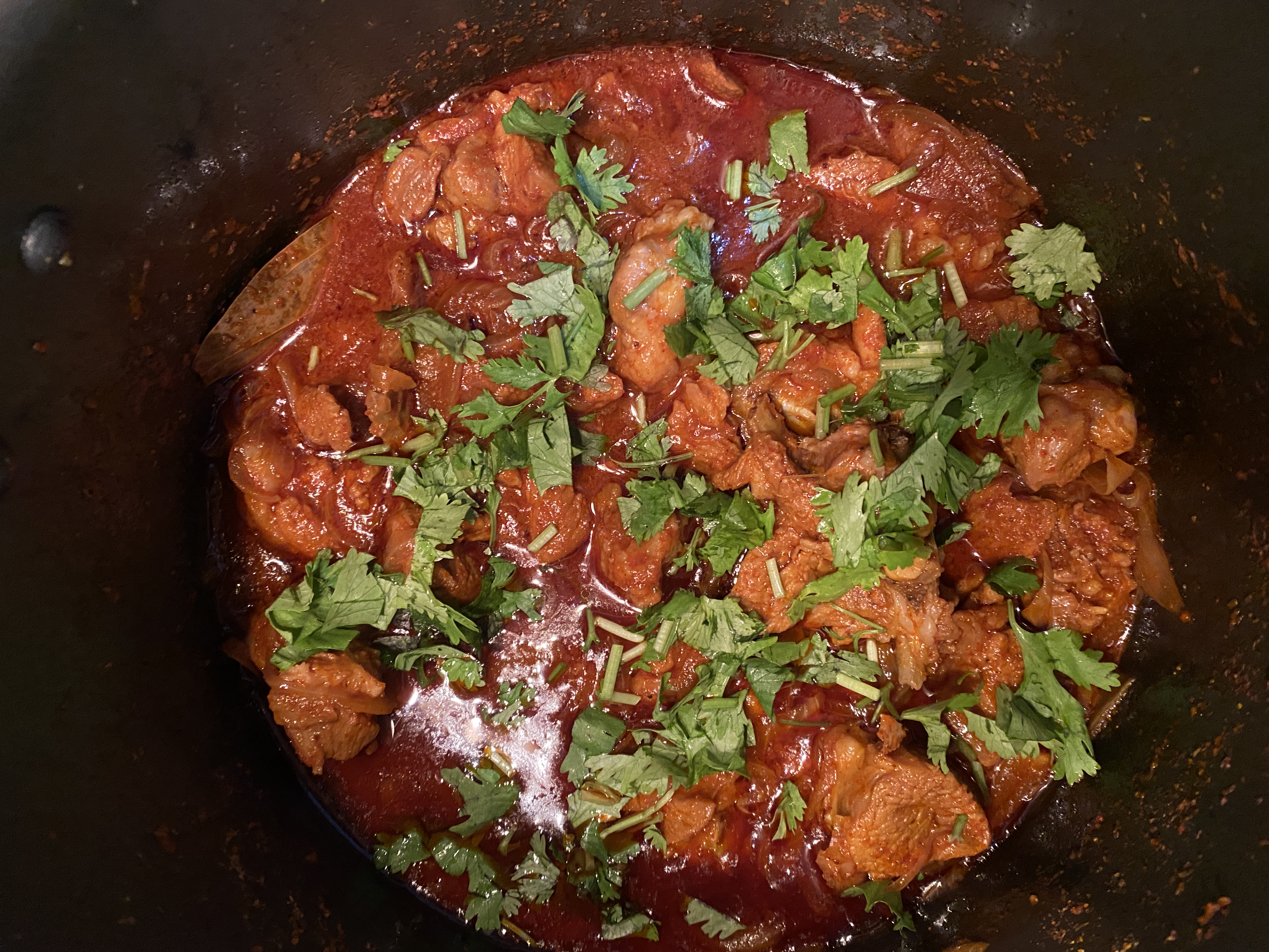 Laal maas is a meat curry from Rajasthan, India. It is a mutton curry prepared in a sauce of yoghurt and hot spices such as red Mathania chillies. This dish typically is very hot and rich in garlic, the gravy may be thick or liquid and is eaten with chapatis made out of wheat or bajra.