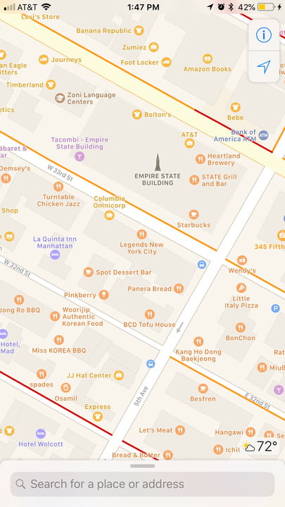 Before you've even entered a location or begun navigating, you'll notice a few differences in the way maps are represented. On Apple Maps, the surfaces are flatter and show more default locations. The user interface is also clean and simple. You can search for a specific location using the search bar at the bottom of the screen and change the maps settings (map, satellite, or transit) by tapping the information button in the upper right.