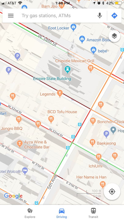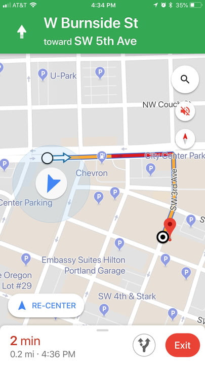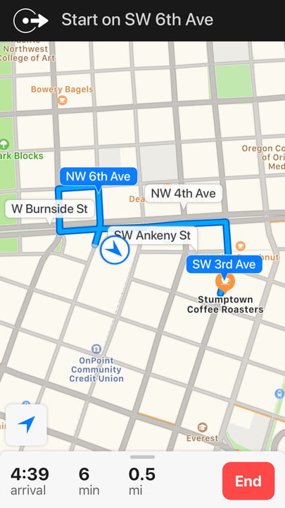 When it comes to the actual navigation screen, Apple's is once again very simple (particularly if you choose as your mode of transportation). There are not a lot of icons on the screen, which limits distractions if you're using the app while driving. if you zoom in or choose the walking mode, you'll see more general locations.