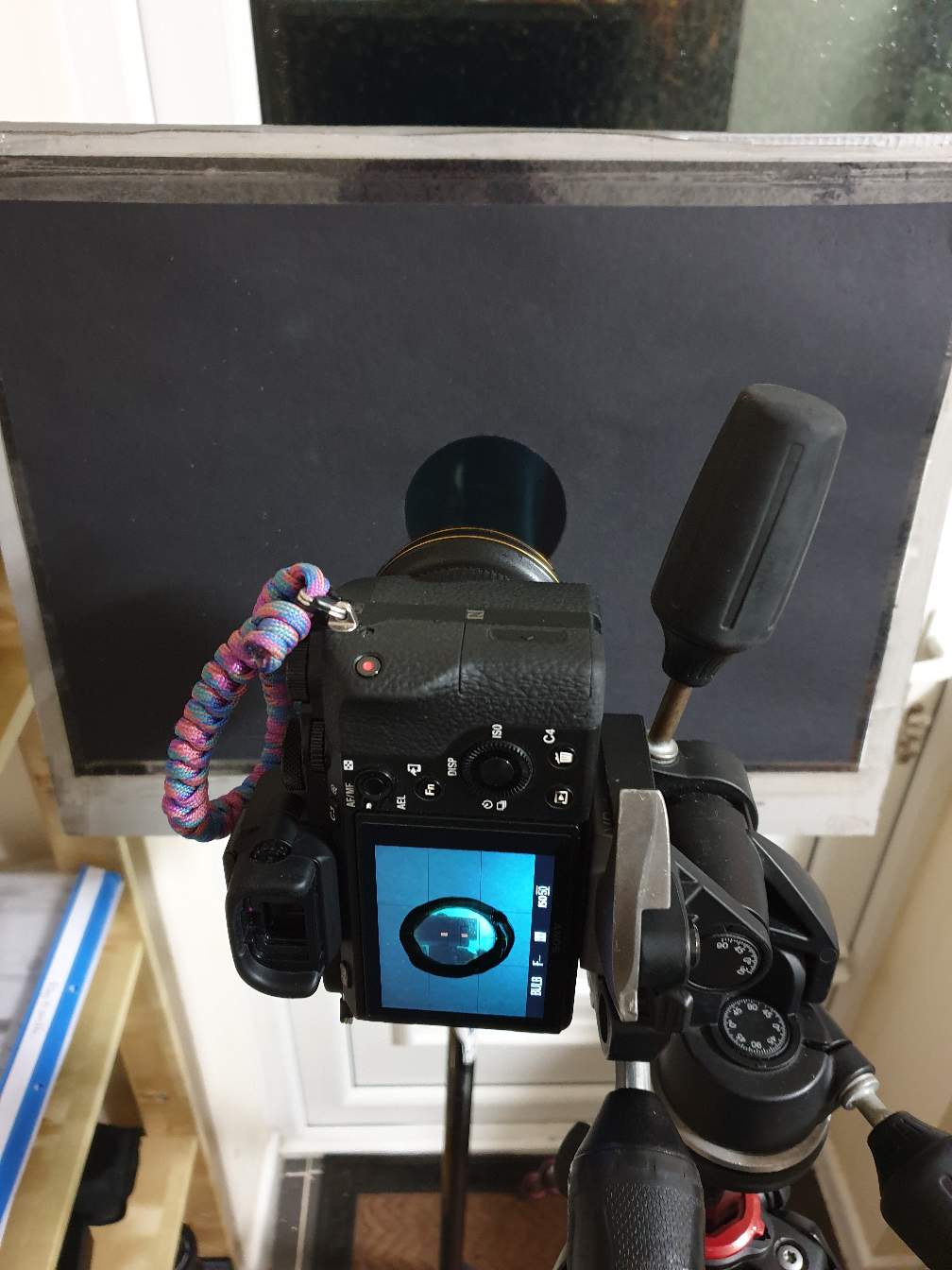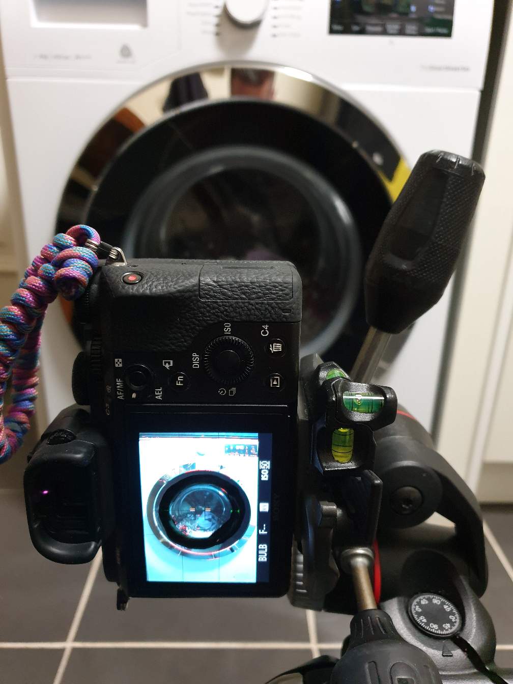 I lit the washing machine with the lp brushes portrait scanner, swapped tripods to the cardboard with a disc cut out at my back door. Remove lens cap, hobble outside and paint around my hand with the black fibers.