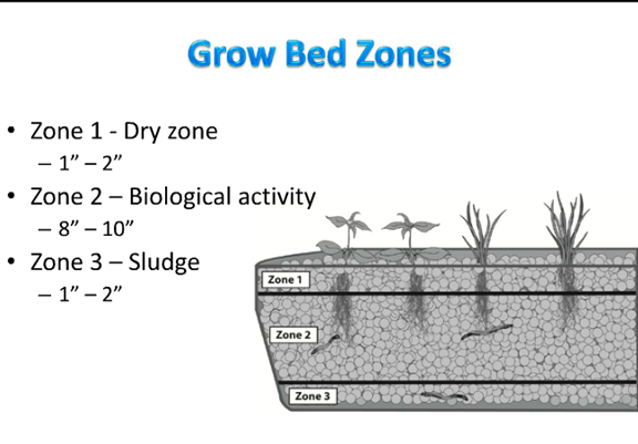 The first zone is the dry zone, or area that is not touched by the water of the system, the second is called the biological zone, and the third is called the sludge zone by many groups who teach aquaponics.