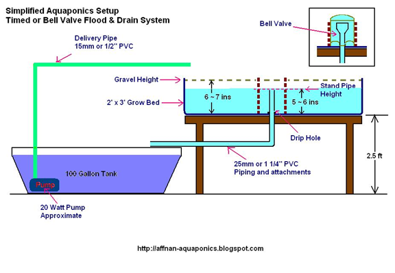 The idea behind this arrangement is that fish waste water is pumped to the growbed and the growbed media acts as a filter for the water, catching solid waste and cultivating our beneficial bacterial. The plants grow and absorb the nutrients left behind and walla.. clean filtered water drains back to the fish tank from a gravity fed bell siphon. Simple right? Well, lets look a little closer.