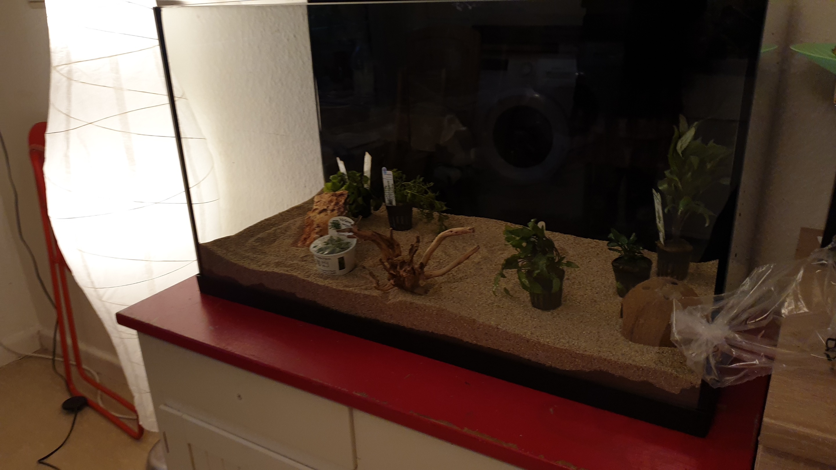Yesterday we (my girlfriend and me) bought this 126 liter fish tank, sand, stones, plants and additional deco to start a new little hobby: aquaristics :)