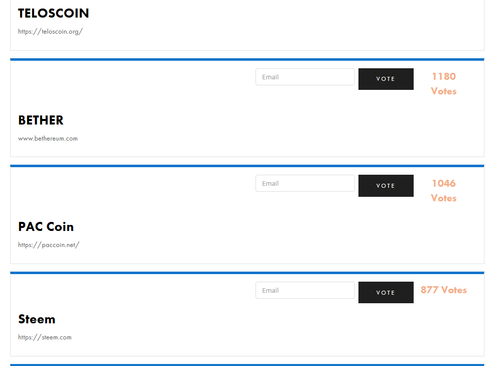 تحتل المرتبة الخامسة ب 877 تصويت وفي المرتبة الأولى توجد STEEM حاليا عملة
