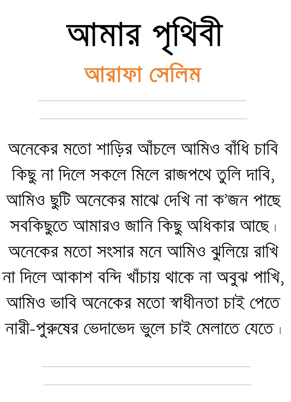This Poem is written by Arafa Selim. Dear friends, this is Arafa Selim. I am a Bengali Writer I have 1000+ Bengali Poems (More Than One Thousand). Today I want to share the 1st part of the Bengali Poem My World (Bengali name is 'Amar Prithibee') on Steemit. I am sharing this Poem part by part. Let's have some fun.