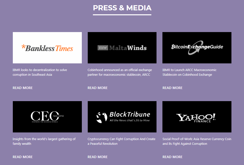 IBMR.io is registered in Singapore, and its first focus of development is Southeast Asia. Through the issuance and support of ARCC, Asia Reserve Currency Coin, IBMR. io intends to break the cycle of poverty, corruption and wealth disparity in emerging markets through the decentralized properties of cryptocurrency and blockchain technolo