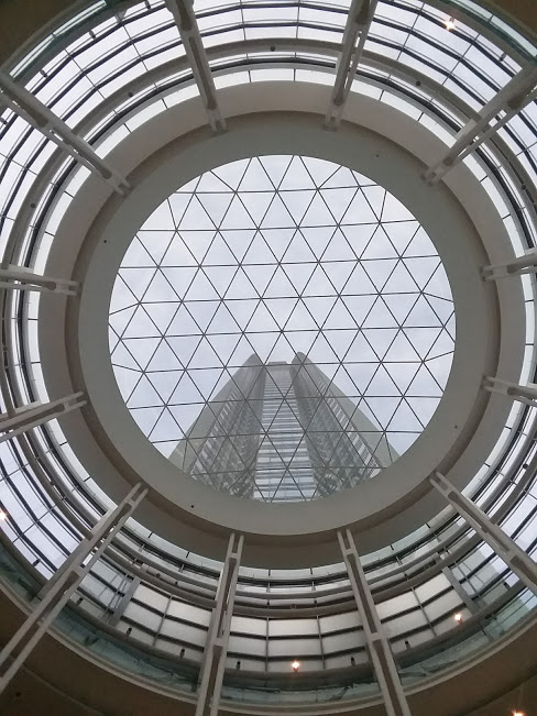 This photo I've taken from the Rotunda of the Devon Energy Tower, in Oklahoma City, Oklahoma, last year. I love how you can see through the roof of the Rotunda and see the tower itself. The Rotunda provides 12,522 square feet (1,163 square meters) of welcome assembly space and has hosted fundraisers, holiday balls, corporate dinners, and civic gatherings.