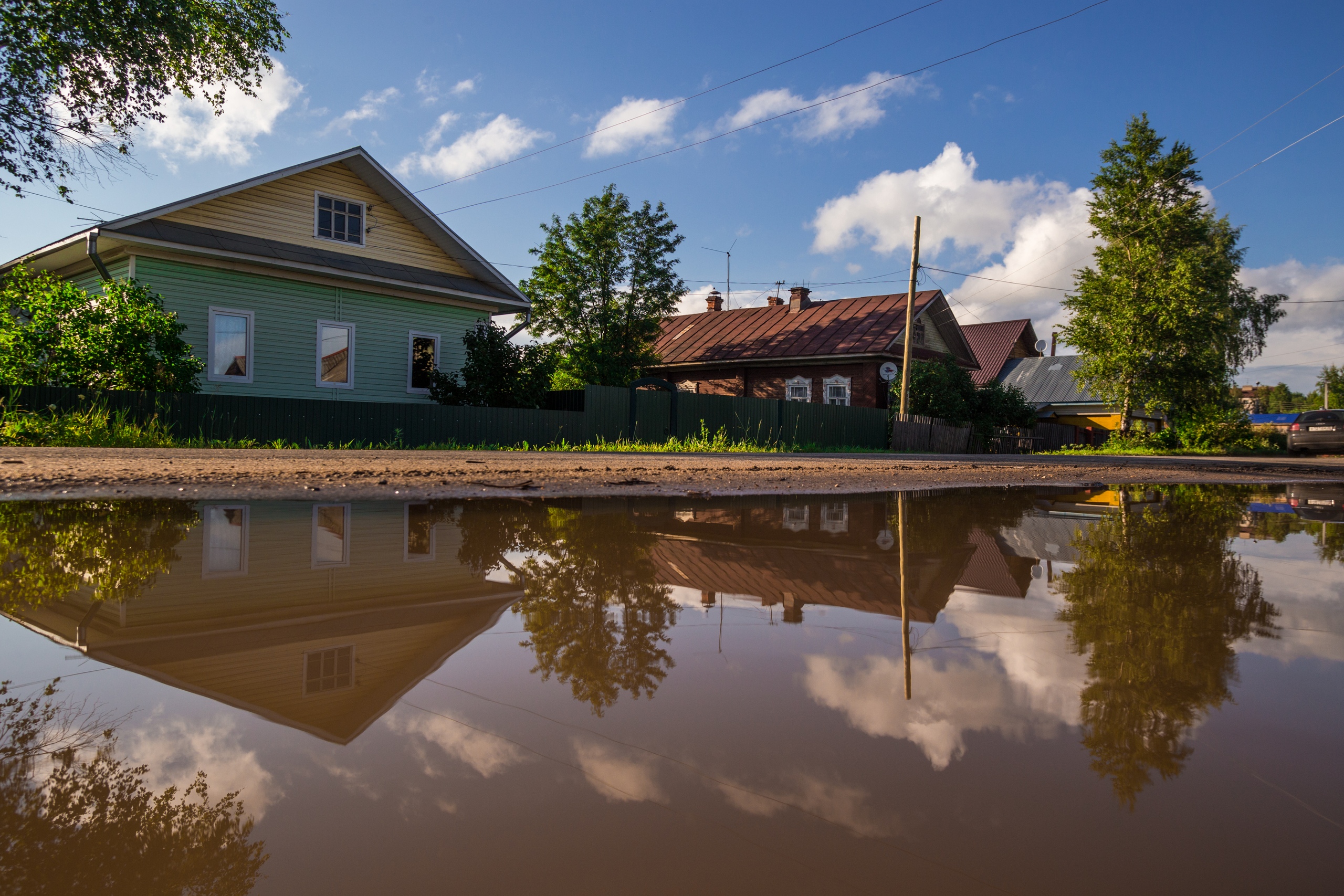 After the summer rain, like after any other, puddles are formed, which makes it possible to photograph reflections. I used to shoot them only in the spring, when huge puddles appeared during the melting of snow. Now I can take a bottle of water with me and do it myself. It's all in the foreshortening! If earlier I shot, holding the camera with the viewfinder at the eye, now I put it as much as possible to the surface of the water...so much that sometimes I even touch it.