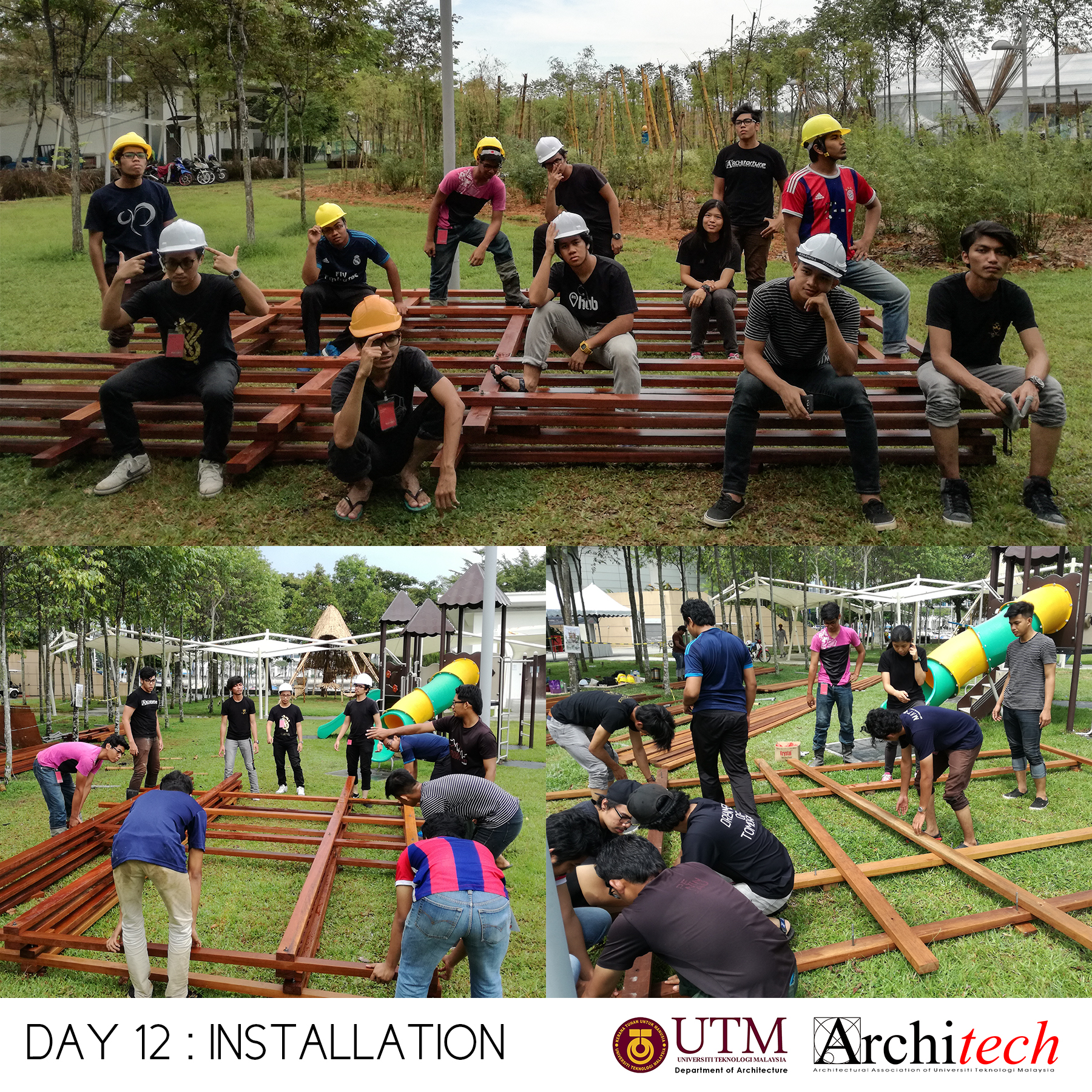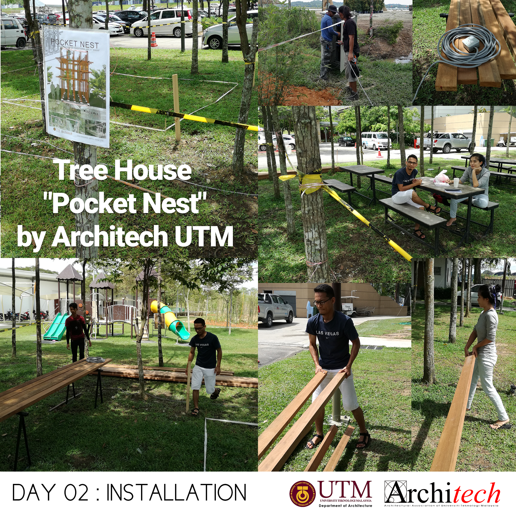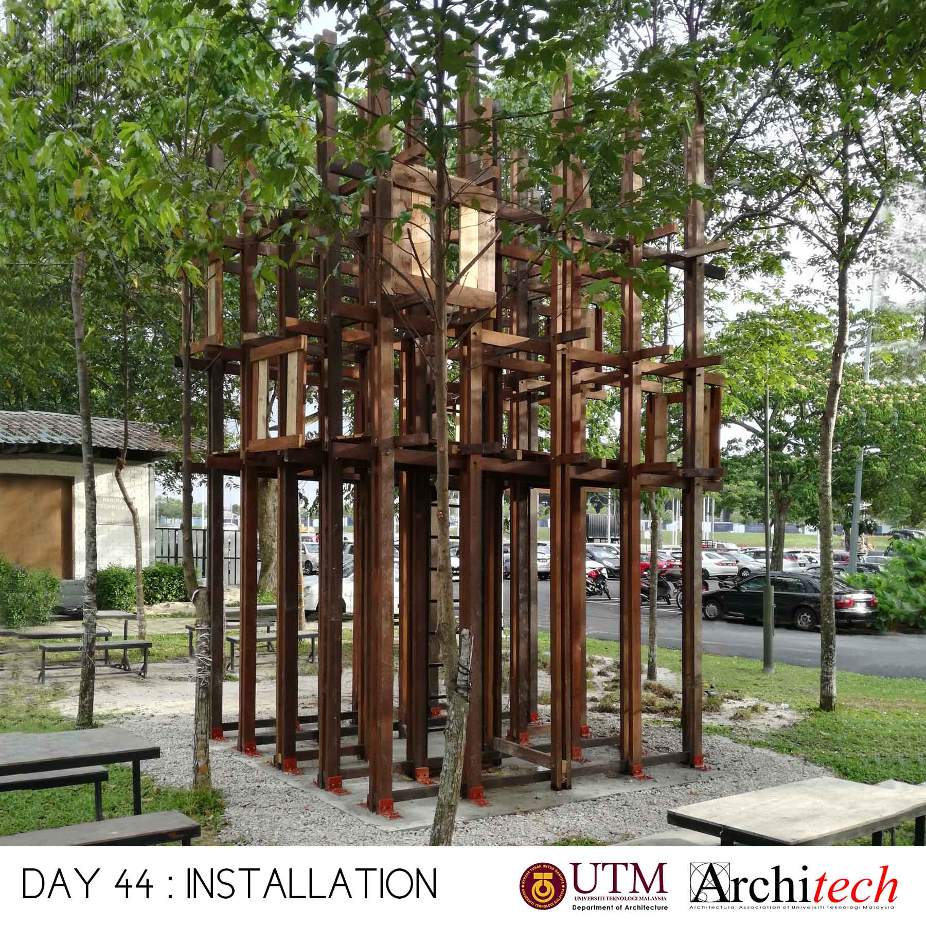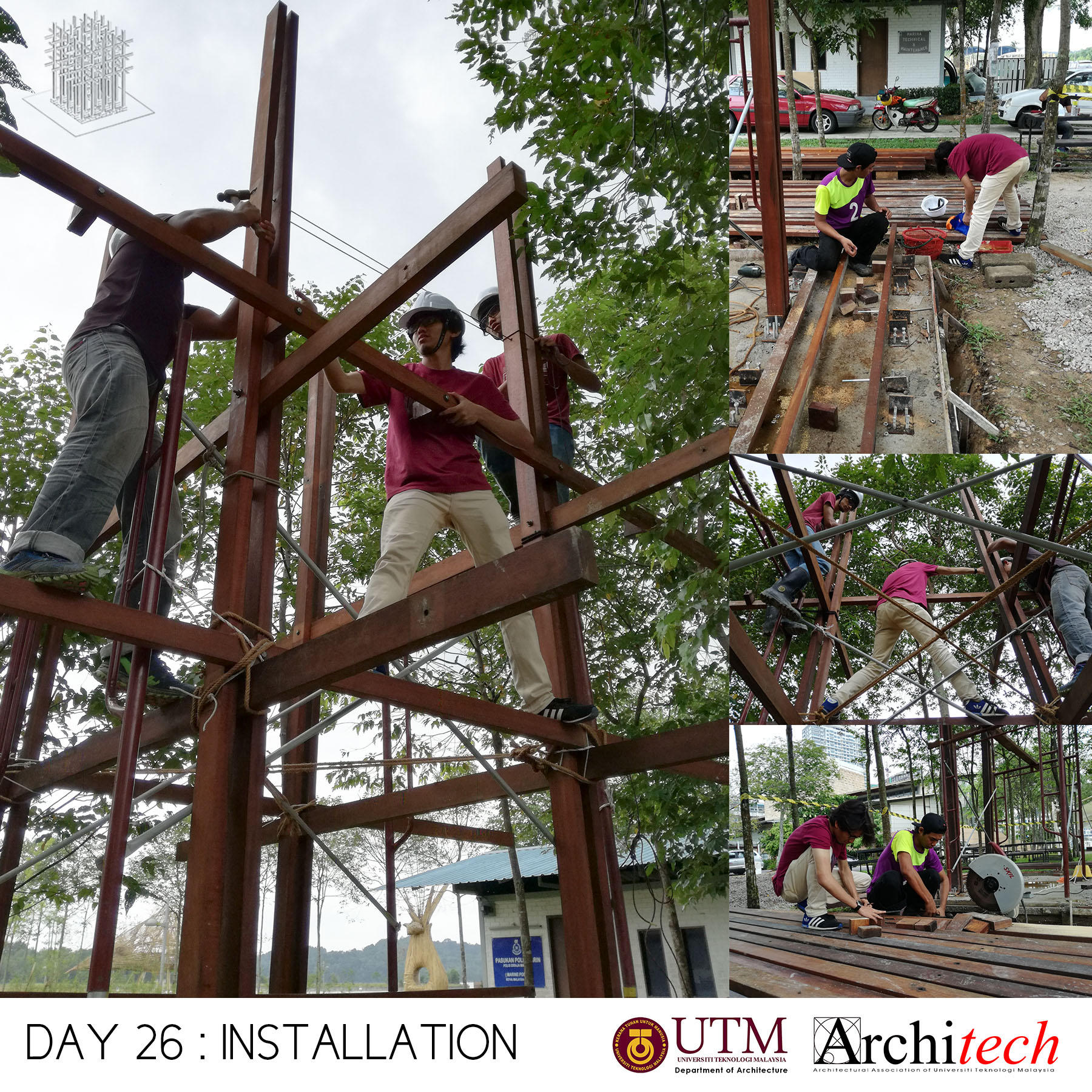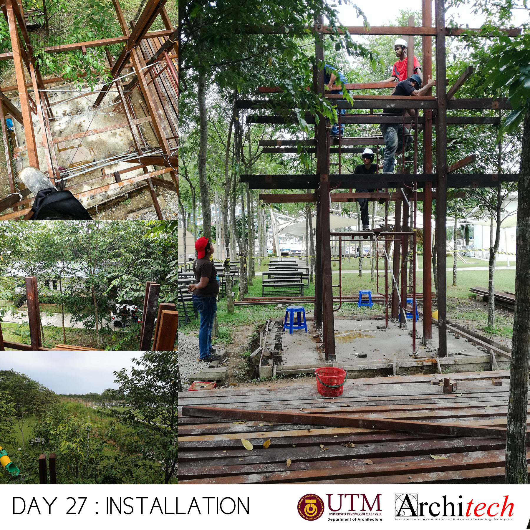 This project could never succeeded without a collective support from our society: Design partner, Chu Shu Ern, Nizam-Salim (nominated sub-contractor), Adli Sufiyan (onsite engineer) , Jamil Sodakin (concrete foundation specialist), special team force by M Hidayat, Halim J, Azril Adnan, Saiful Islam, Architech Society from Universiti Teknologi Malaysia comprising Syahir, Amir, Jheeson, Jeffry, Afiq, Sarah, Qamarul, Hazique, Xin Lei, Haithar, Sid, Aizat, Ashriel, Shaifull, Fitry, Akmal, Noramin, Fadhiah. Much appreciated to UTM’s senior lecturer, Dr Lim Yong Long. The curator team also did an amazing job and to Yeoh Lian Heng, Wong Xiang Yi, JJ Ng, we thank you guys. Also much gratification to the very honourable funder and linked to Khazanah Nasional Berhad, Nani Kahar from Lab DNA. Not to forget incredible people from Web Structures Multinational Company, they were Ir Ng Pek Har and Mr Angelo. Finally huge appreciation to all who helped us by giving motivational and encouragement support.