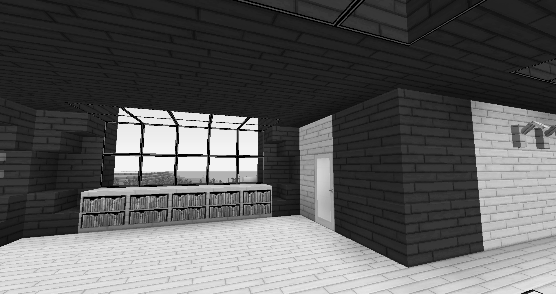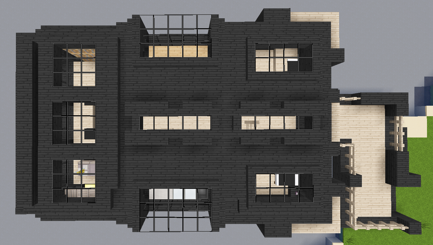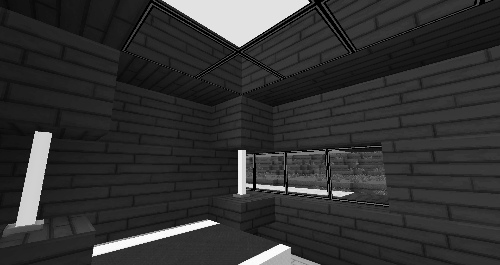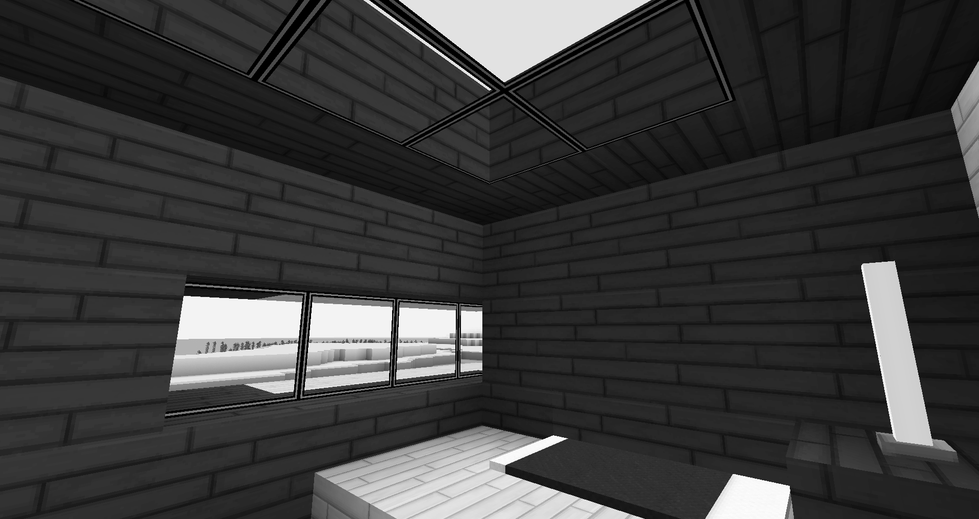 The room with the three big glasses was meant to be the master bedroom but it turned out otherwise. Now it is the living room. The two main bedrooms are located at the entrance of the building because you will have "the most" privacy there. What is also special about this little idea is the "complex" roof with the glass in it. It is such a shame that there are no half-glass-blocks in the normal version of MINECRAFT.
